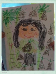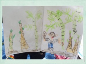 沢山の仕掛けに興味をそそられつつ、奥に進んでいくと第2のゲートに到着です。ここでは、ミーアキャットの世界が見られるということで、早速中に入りました。待ち時間も子ども達にとっては貴重な時間です。リュックからスケッチブックとクレヨンを取り出し、壁にある動物達の写真を見ながらお絵かきタイムのスタートです。オオカミを描きながら、どこに住んでいるのかな?と想像が膨らみます。