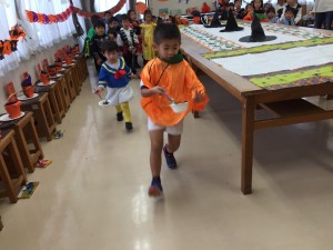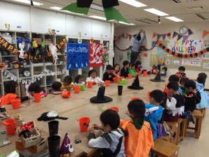 年中さんが作ってきたハロウィンの飾りで、先生方に会場の飾りつけの仕上げをしていただいたら、子ども達は先生に絵本を読んでいただきます。普通なら小さなお友達には少し長いお話しかもしれませんが、お話に沿って先生がクイズをしながら進めてくださりますし、小学生や年長さん達にリードしていただけるので、飽きることなく楽しめてしまいます。みんなで絵本の世界を楽しんだおかげで、仮装をして集合したことによる、少しざわざわした気持ちが落ち着き、良い集中力が湧いてきたようです。