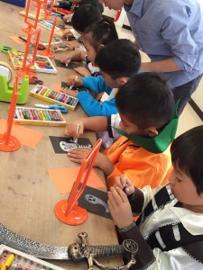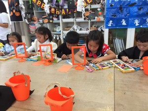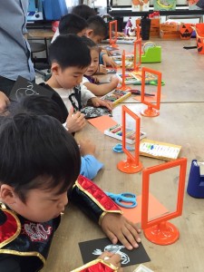 そこでさっそくお絵描きや工作に取り掛かります。今日はみんなでいただくおやつのために、テーブルを飾るアイテムを自分達で作ることになっています。お店に行けばいろいろなハロウィンの物が売っていますが、オレンジや黒、白などのハロウィンらしい色を使い、そこにハロウィンのモチーフを自分で飾ることで、自分だけのおやつのテーブルをセッティングできてしまうのです!