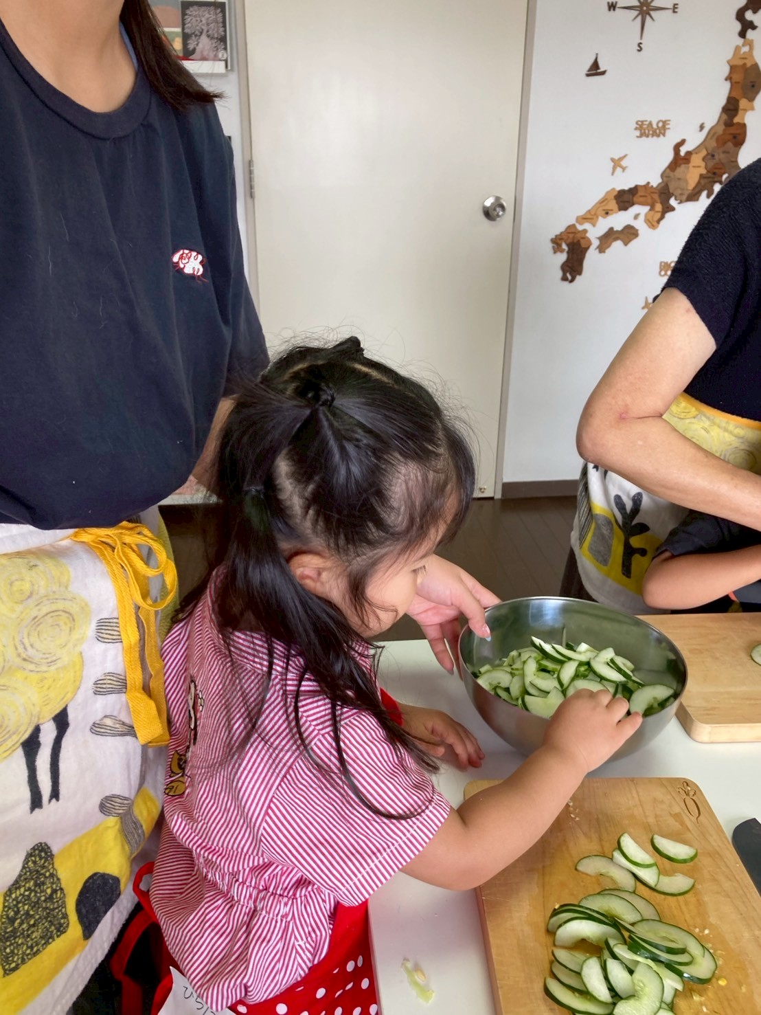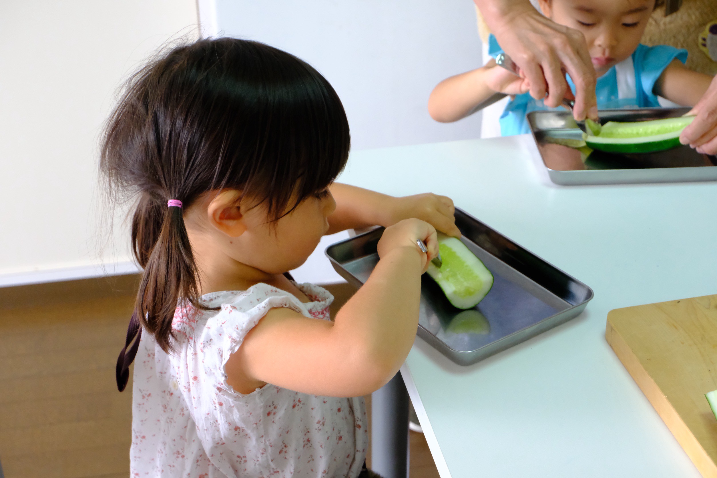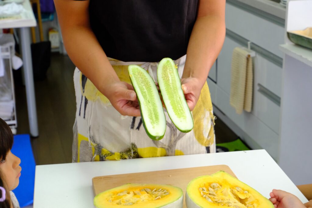 今度はきゅうりとカボチャの種をスプーンで取ります。どの子も丁寧に、器用に種を取ってくれました。種を取ったきゅうりは薄切りにし、塩もみをします。きゅうりを切ってくれた子たちはお味見の手が止まらず、きゅうりを美味しそうに食べていました。