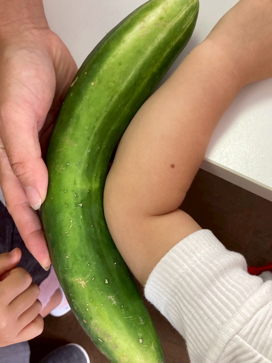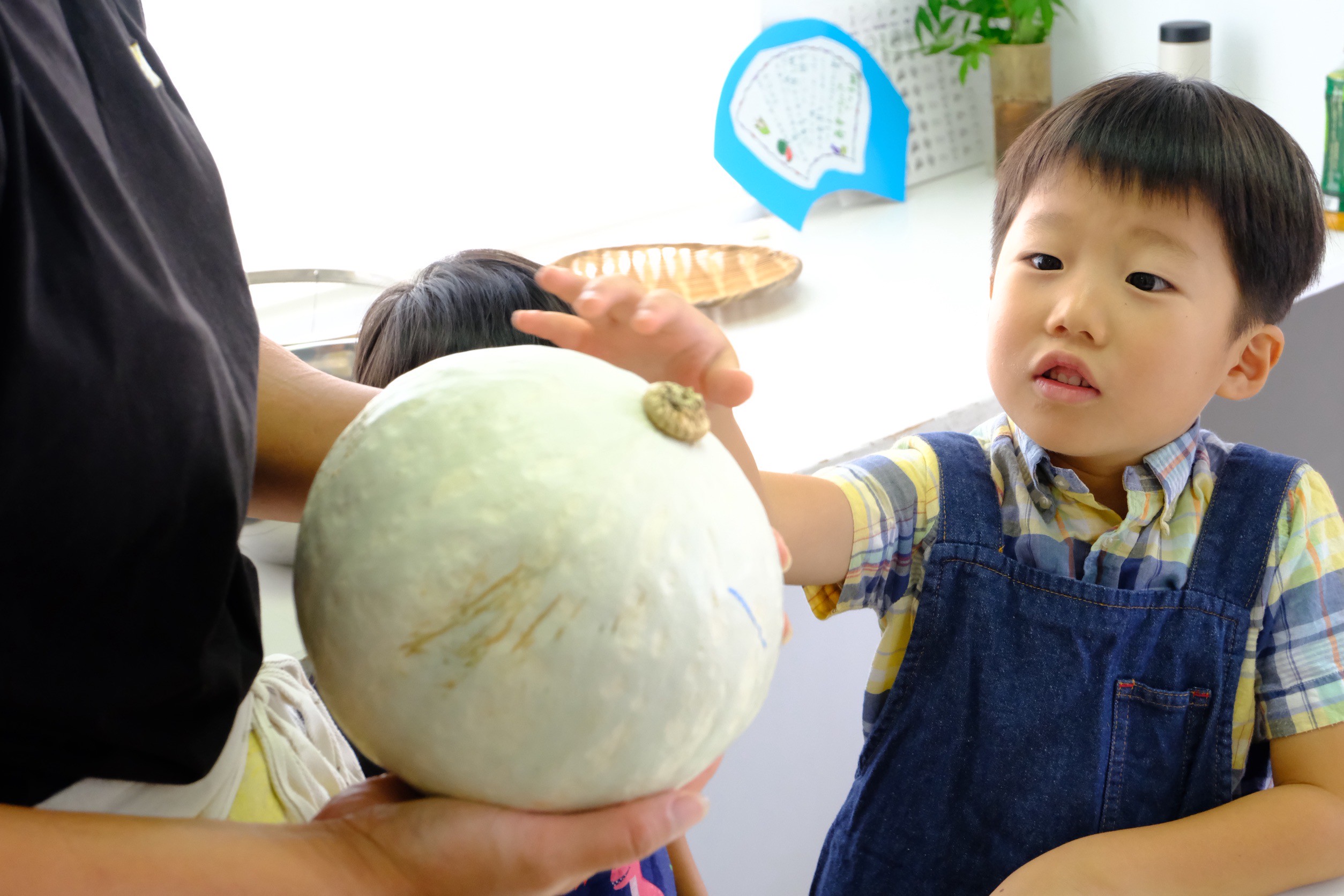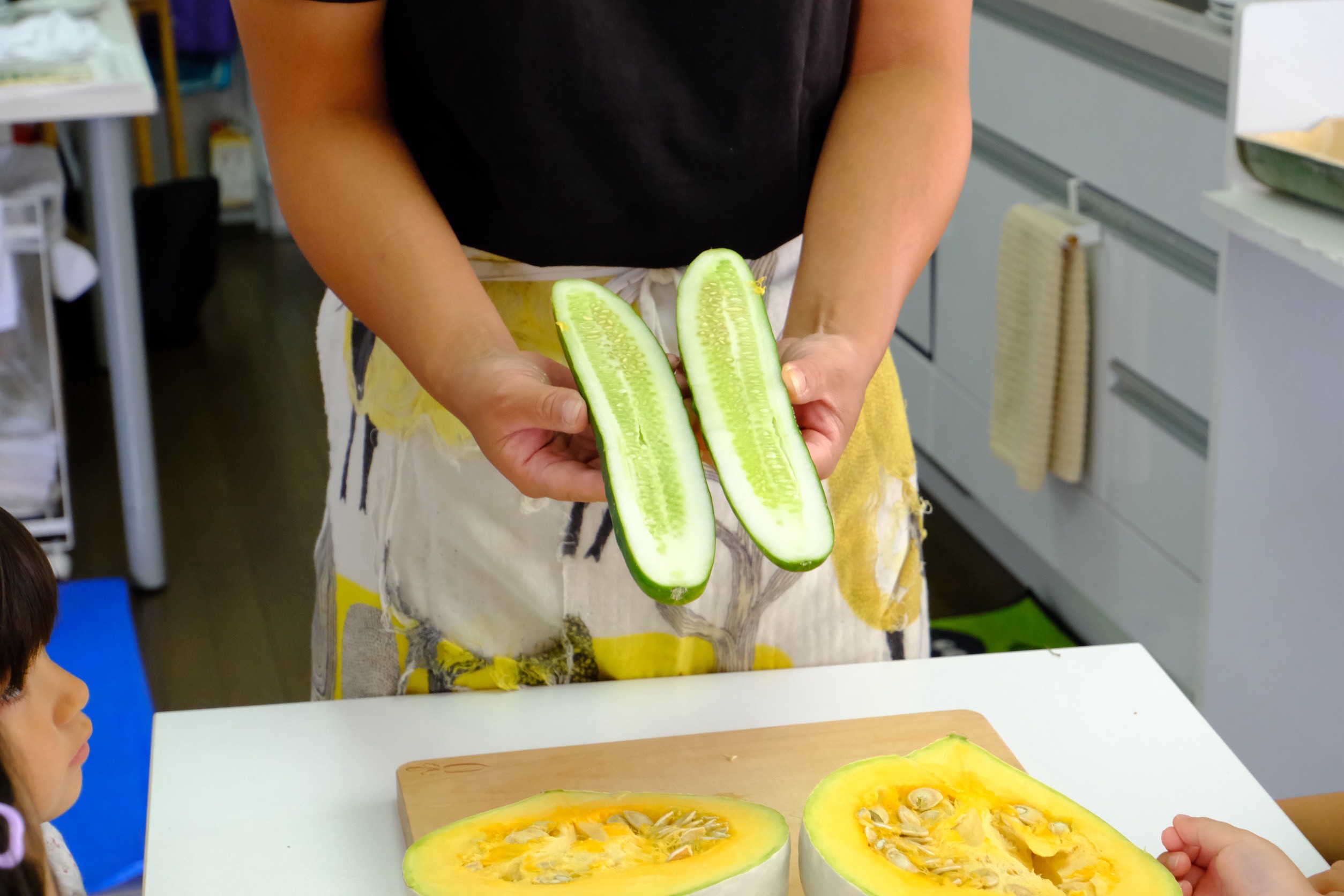 まず初めに、これから使うお野菜をみんなで観察しました。初めて見る白いカボチャにみんな興味津々で、中は何色だと思う?と聞くと「赤!」「オレンジ!」「黄色!」と思い思いの予想を聞かせてくれました。切る前の白かぼちゃを逆さまから見て、「玉ねぎみたい」という子もいました。子どもの発想は非常に面白いです。オレンジ色の中身が姿を現すと、今度は「メロンみたい!」「甘い匂いがする」「食べたい!」と盛り上がります。続いて切るのは大きく育ちすぎてしまったおばけ胡瓜です。縦半分に切ると種もメロンの種のように大きくなっている部分があり、きゅうりとメロンは仲間かもしれない、かぼちゃもメロンと仲間かな?と子どもたちなりに関連づけていました。さらにデザートにいただくスイカも登場すると、また種が一緒!でも色は違う!と気づいたことがどんどん言葉となって出てきました。旬のものにはやはり繋がりがあるんだと再認識できました。