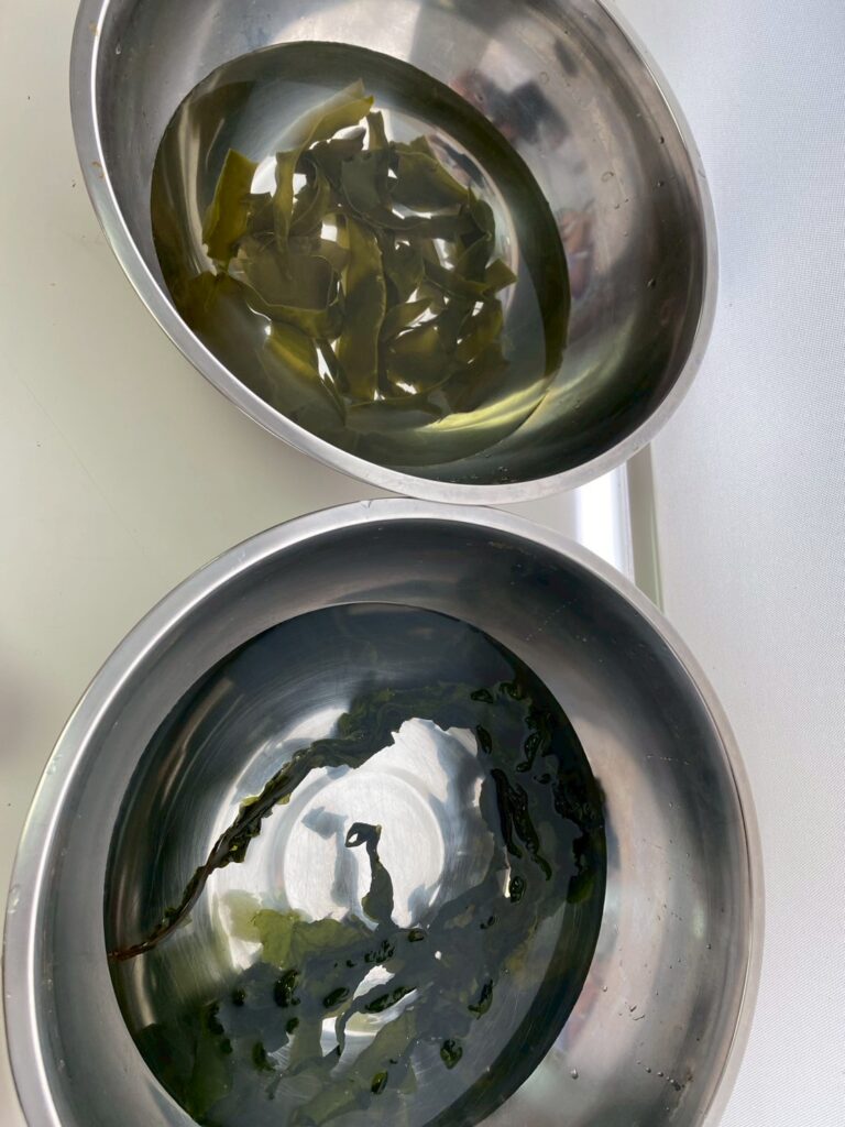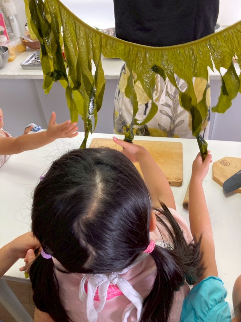 次にご飯とお出汁の準備です。初めての子も多かったので初心に戻って、一つ一つ確認しながら行いました。計量カップにお米を入れて計ったら、順番に水の中で手を開いたり閉じたりしてお米を研ぎました。羽釜で炊くので、火にかけたあとも、沸騰したら弱火にする、水分がとんだら強火で10秒、火からおろして蒸らせば美味しいごはんの炊きあがりです。昆布も匂いを嗅いで、触ってみてからお水の中へ入れました。しばらくすると色は緑っぽく、サイズは大きく、触ると柔らかく変身してきました。同時に海藻の仲間のワカメも水で戻します。こちらもパリパリで軽かったのが、大きな1枚のカーテンのようになりました。