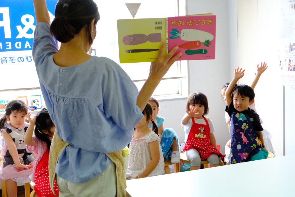 配膳に入る前にしばし絵本の時間をとりました。絵本の中に、今日のお料理で登場した野菜が沢山出てくるので、「今日のかぼちゃは白かった」「きゅうりはこれよりも大きい」など自分たちの体験した世界と絵本の世界を重ね合わせながら楽しむことができました。