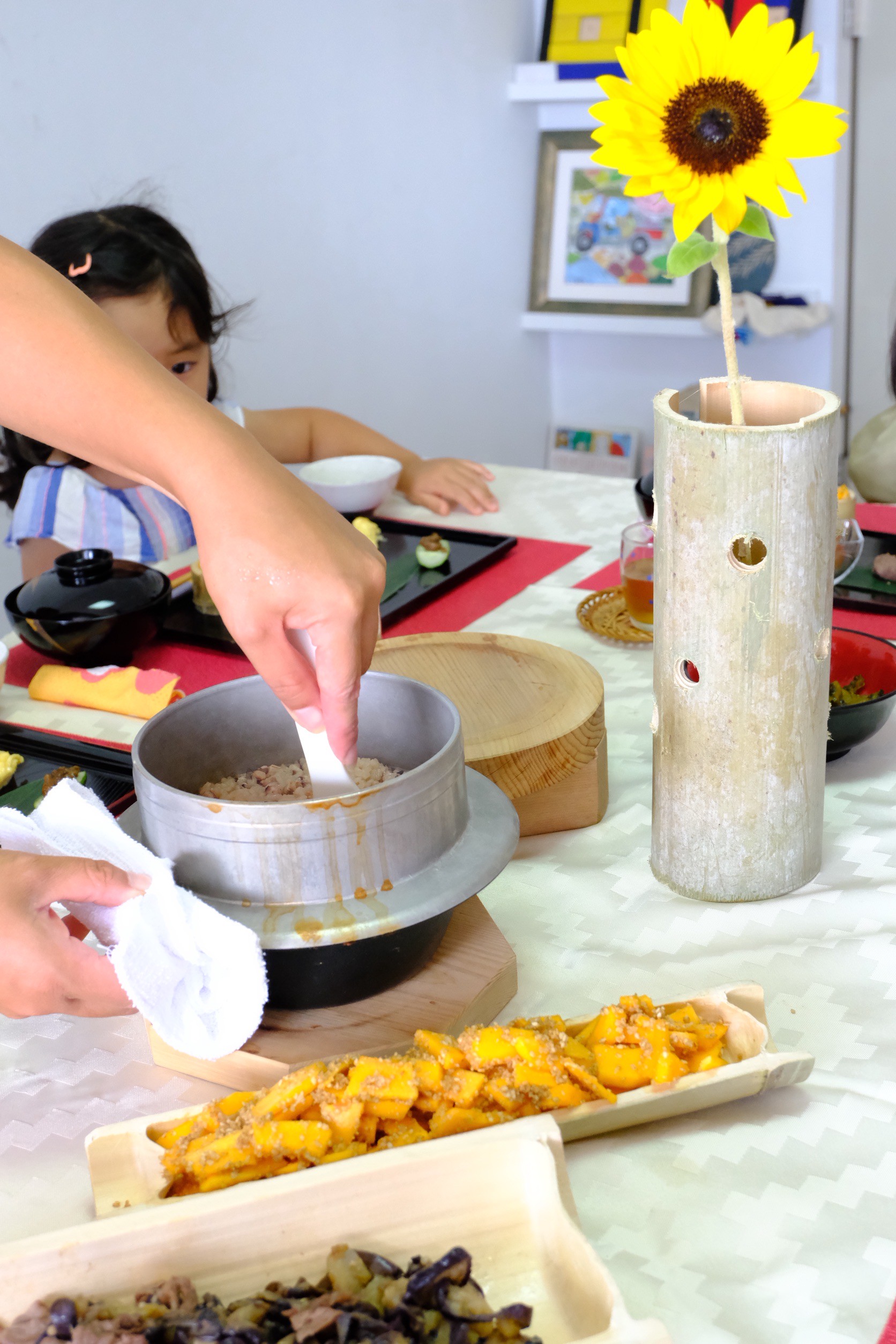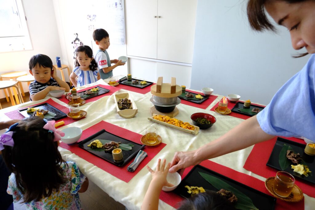 配膳をすることにもすっかり慣れました。小学生を筆頭にまずはテーブルクロス、次にランチョンマットや茶托、お茶碗や箸置きなどを手際よく並べていきます。はじめの頃、テーブルクロスを広げてもすぐに反対側で引っ張ったり、手で触ったりでシワシワになってなかなか準備が整わなかったのが想像できません。お皿の向き、置く位置もそろうようになりました。炊きたてのタコ飯をよそったら、お待ちかねのお食事の時間です。みんなで元気に「いただきます!」