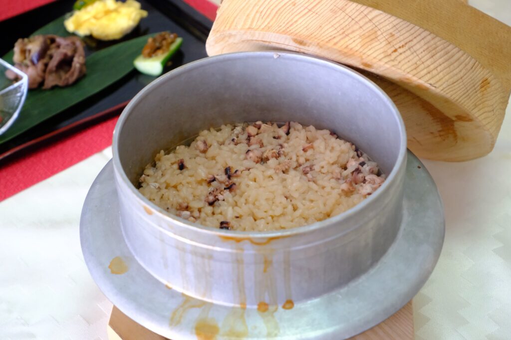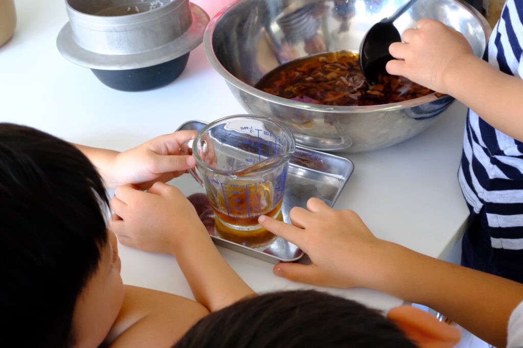 水につけておいたタコは色が薄くなり、代わりに水が茶色く変化していました。まずはこの戻し汁の中に味付けをします。お兄さん達がスプーンを持ってくれて、小さい子たちが醤油やお酒を注ぎました。次に、研いだお米の中に味を付けた戻し汁を加えます。なるべくタコが入らないように、慎重に汁だけを取り出すのがなかなか難しく、「こうやってすくったらいいんじゃない?」「傾けた方がやりやすいよ」とアイディアを出し合いながら進めました。汁を入れ終わり、戻したタコも加えたら火にかけて炊いていきます。