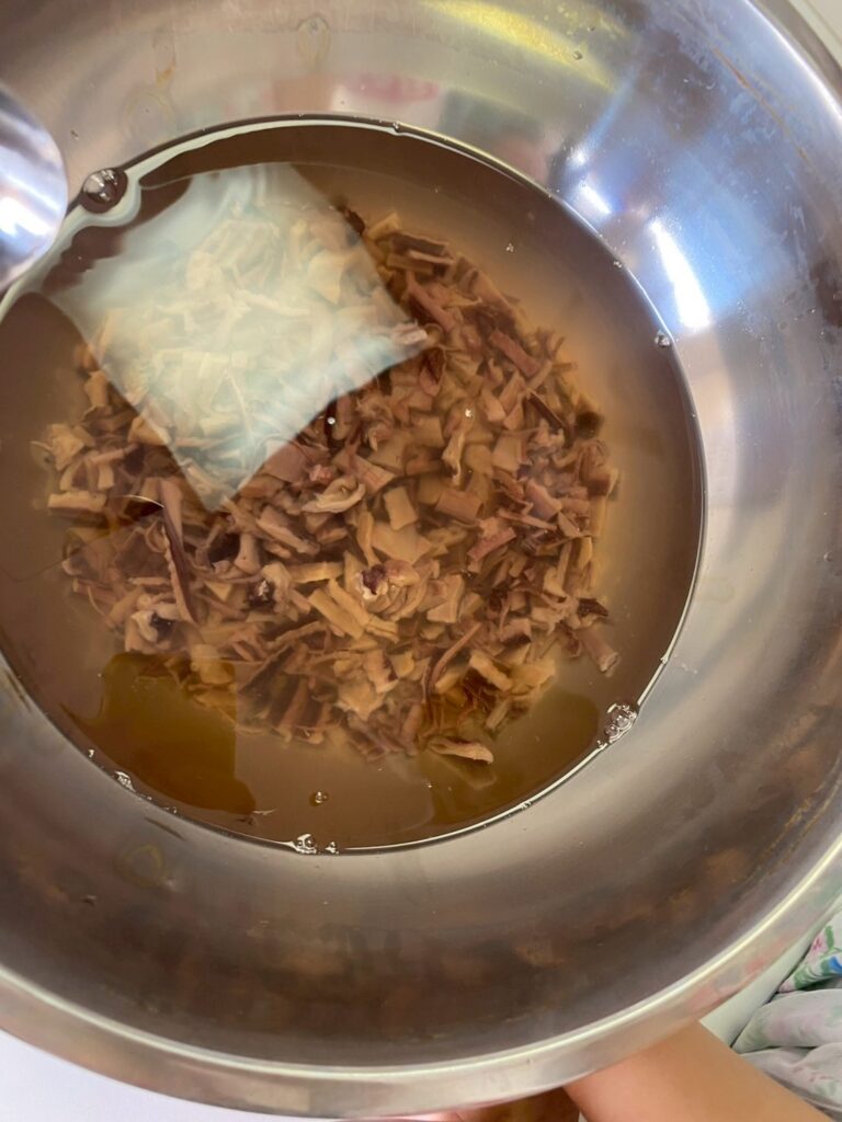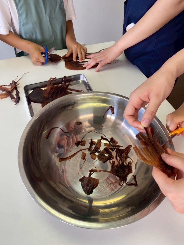 夏休みに日間賀島からやってきた蛸を使ってタコ飯を作ります。ぺちゃんこになって干されたタコをみせて「なんでしょう?」とクイズを出すと「足が8本だからタコかカニかな」「宇宙人みたい」と様々な反応が返ってきました。まずは干したタコをハサミで切っていきます。柔らかくて切るのが少し難しそうでしたが、だんだんとコツを掴んできて切るスピードが速くなっていました。飽きることなく夢中で取り組む姿に感心しました。細かく切ったタコは、水に戻しておきます。