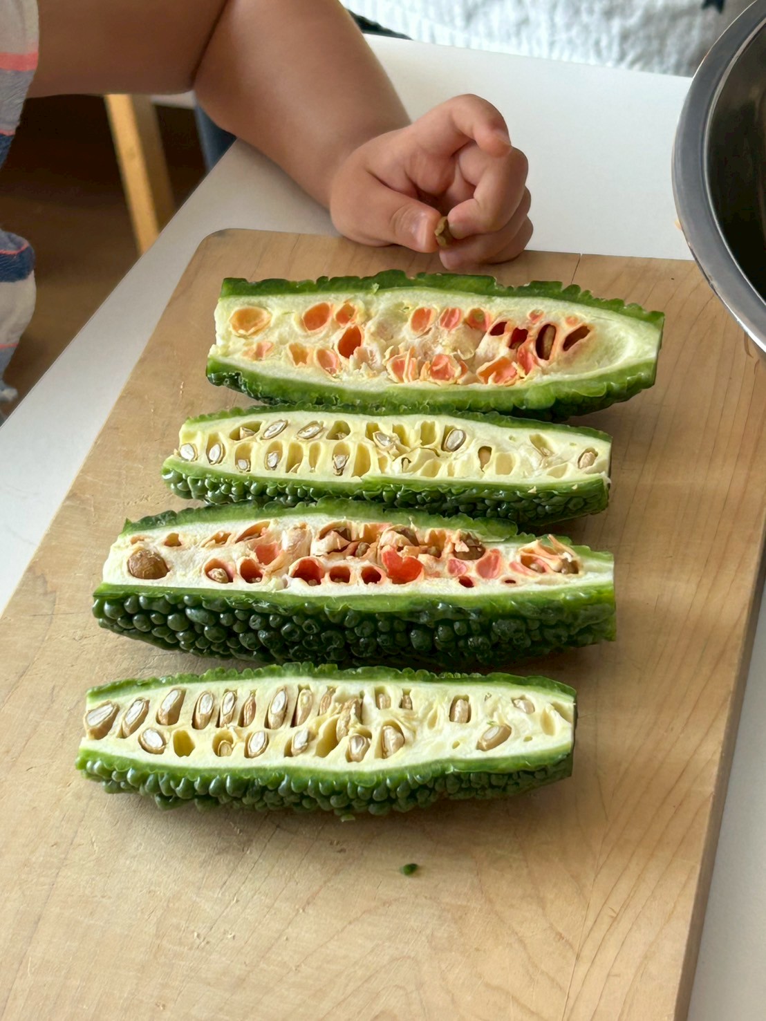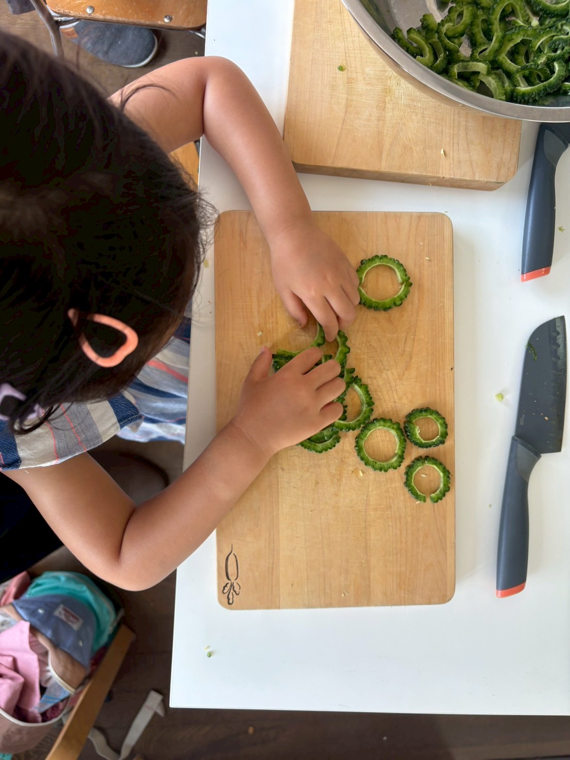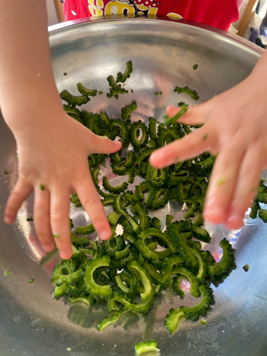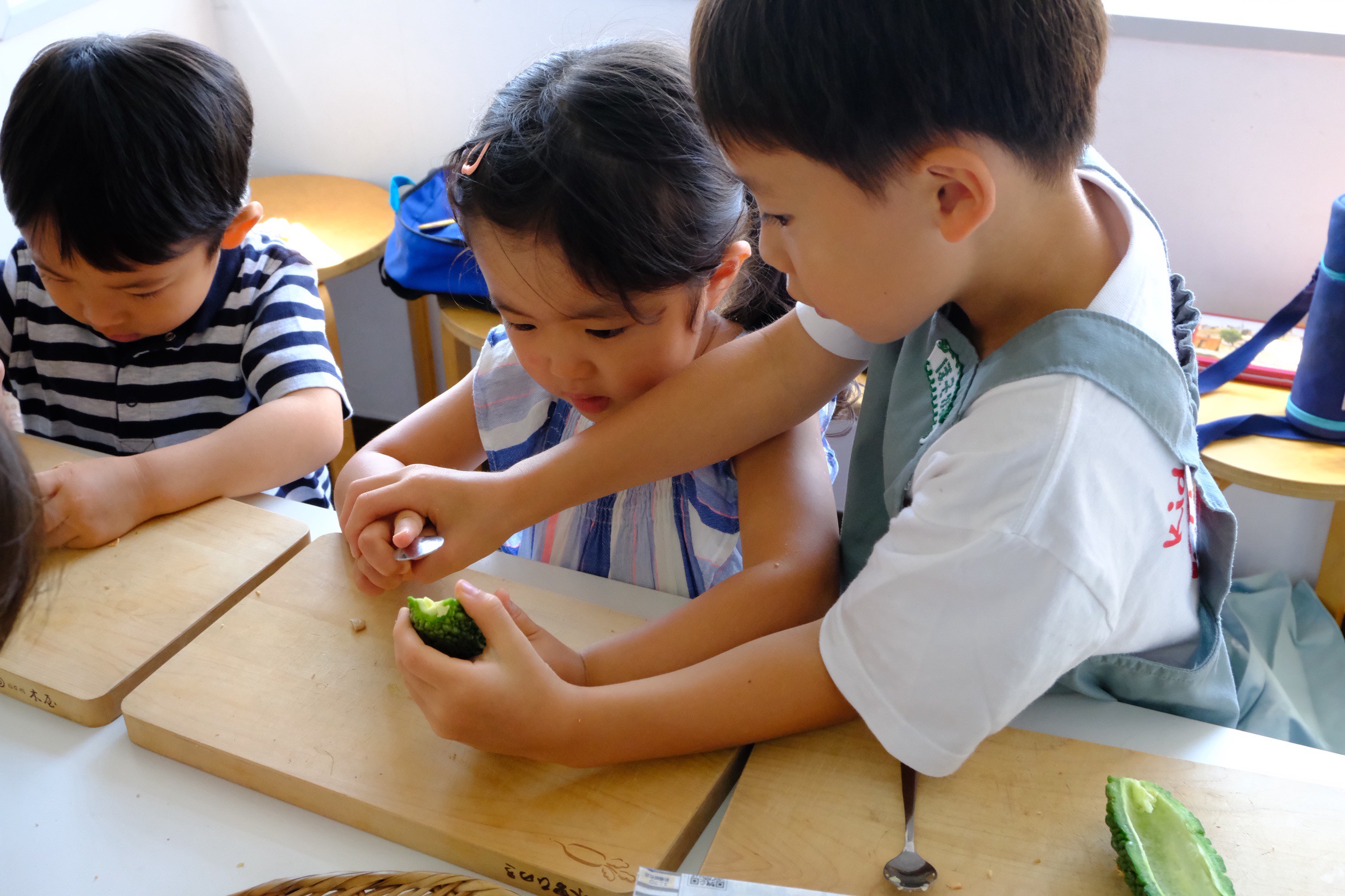 次は野菜たちを切っていきます。まずはきゅうりです。船の形に切って、「いくつできるかな?」と数えながら楽しく作業しました。ゴーヤは半分に切ってみるとびっくり。種が赤いゴーヤと白いものがありました。赤いのは熟している証拠だそうです。どちらの方が苦いのかは食べてからのお楽しみ!中の種とふわふわしたワタはスプーンでくり抜きます。年上の子が「横に持つといいよ」と年下の子にアドバイスする姿も見られました。くり抜いたゴーヤは細切りにします。中が空洞なので力加減が難しいのですが、薄く切ることができていて驚きました。半円の形になったゴーヤを並べて丸を作り、「何個丸ができるかな?」とただ一生懸命作業するだけでなく、楽しむ余裕も出てきました。
