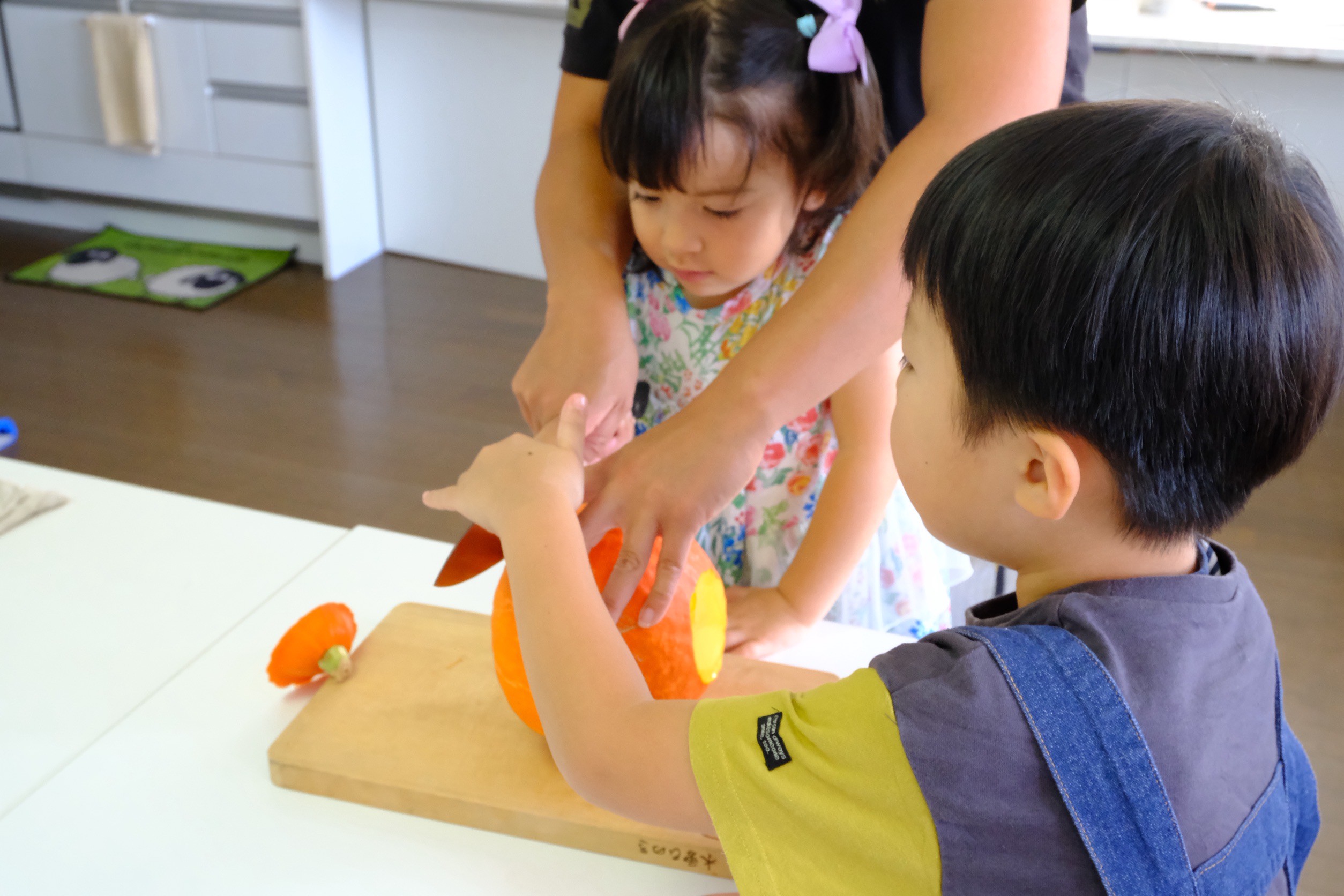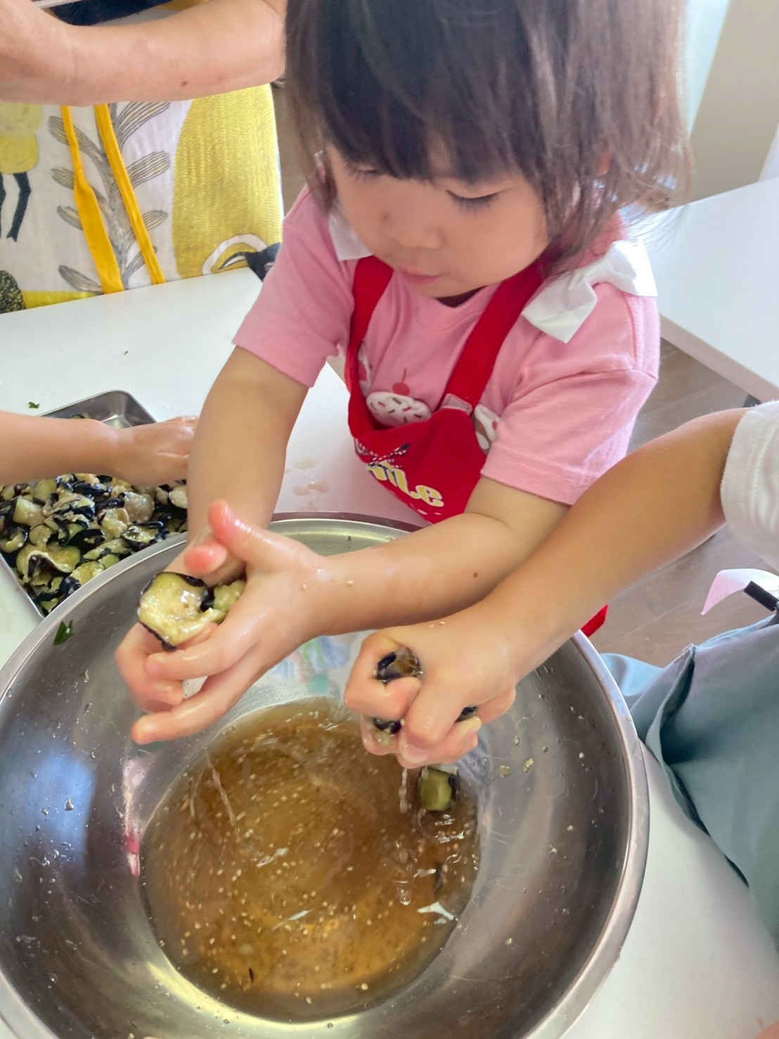 同じように、かぼちゃの仲間でだいだい色の大きなコリンキーとナスも切っていきます。どちらも前回も扱った野菜ですが、先ほどのゴーヤの色の違いが印象的だったようで、「今度は何色かな?」とそれぞれの野菜の断面が見える瞬間に子どもたちは大注目です。すでに知っているものでも、「今回は違うかもしれない!」という視点を持つことで新しい発見に出会えるチャンスがどんどん増えていきます。ナスは柔らかく、コリンキーは固いなどこちらも力加減が少し難しそうでしたが、途中で作業をやめてしまう子は誰もいません。切ったゴーヤとナスは調味料を加えてもみもみ。コリンキーは胡麻和えにしました。