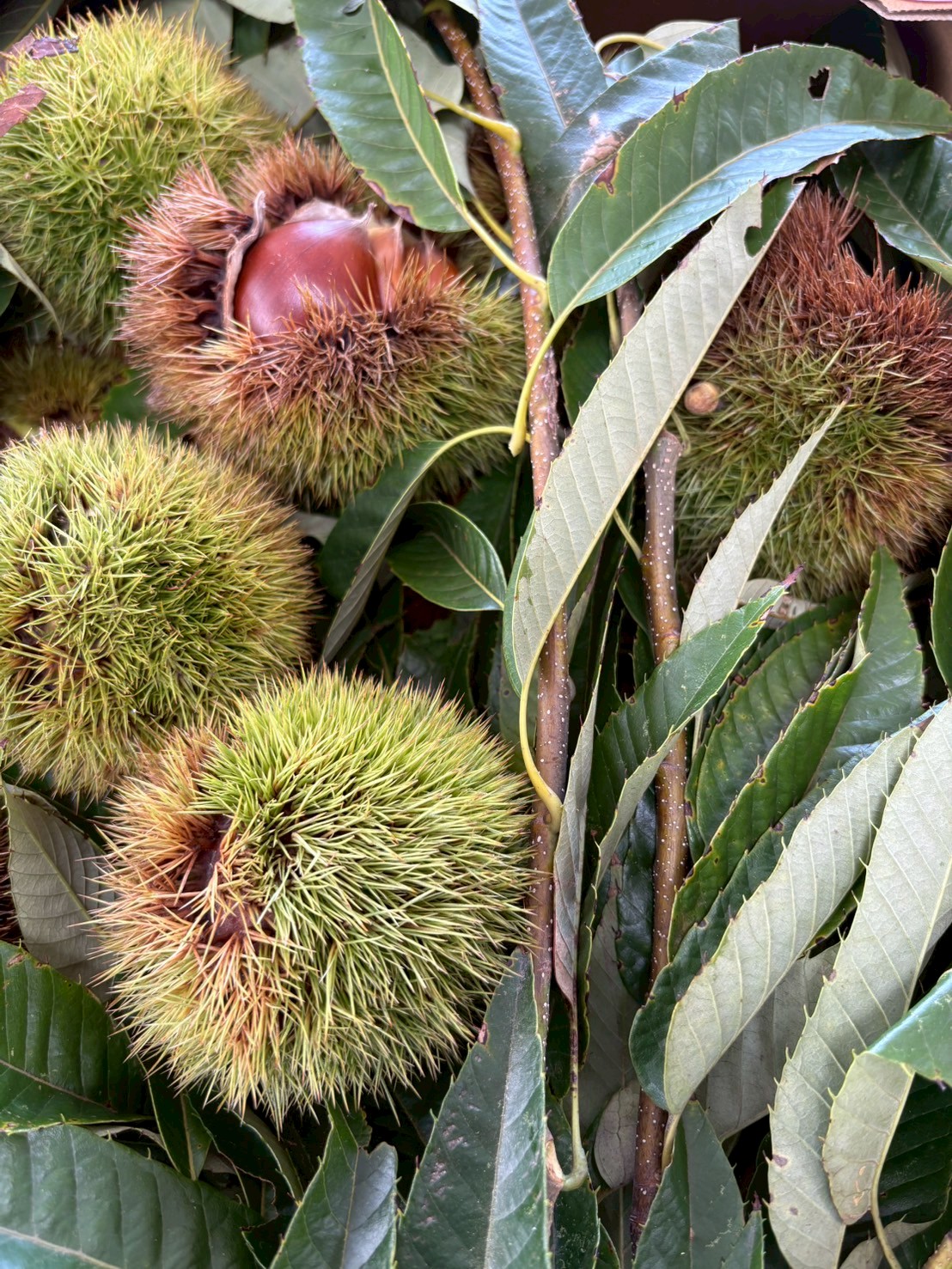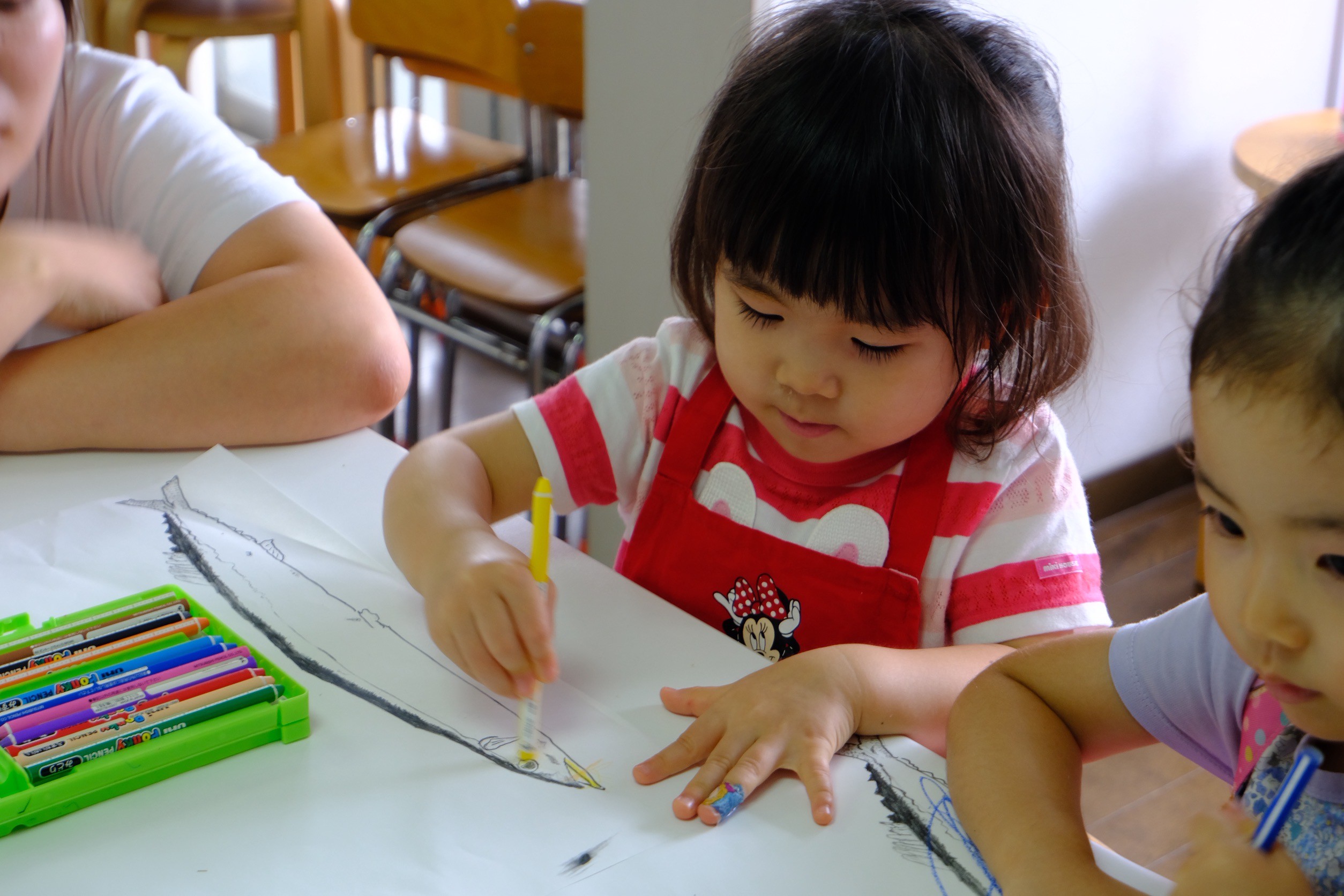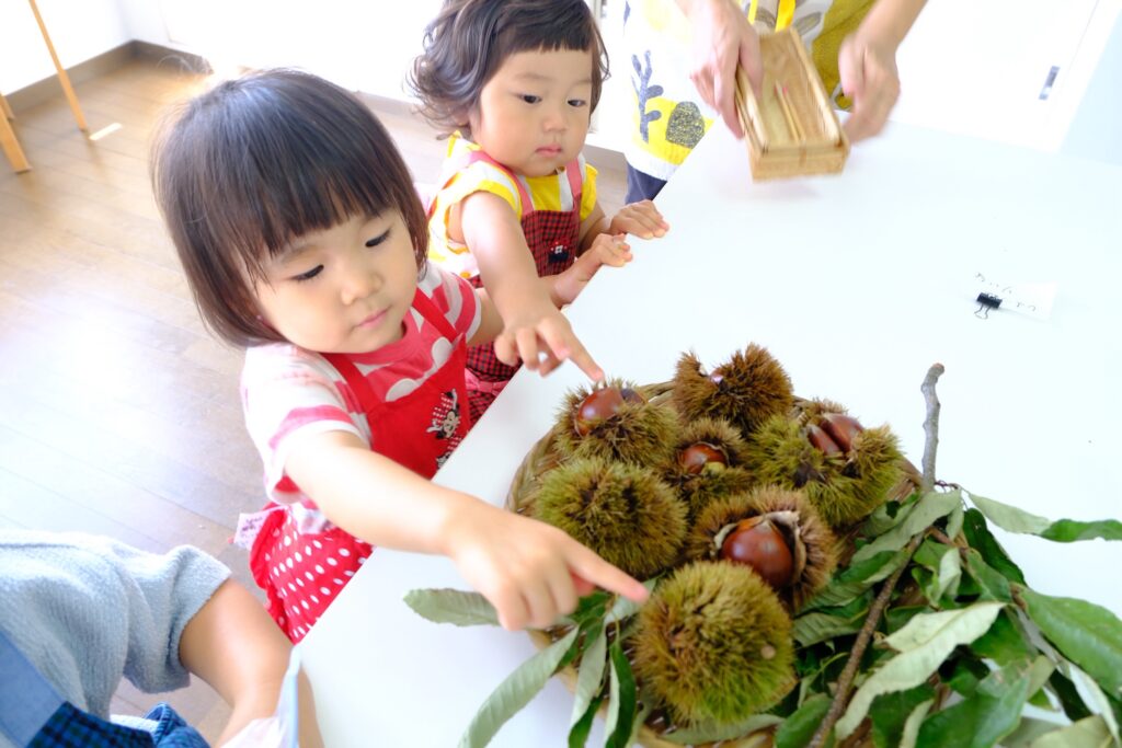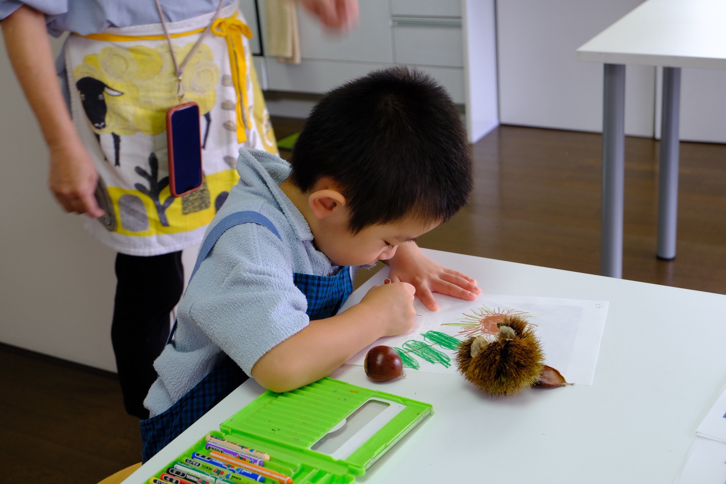 栗の木から枝と葉っぱもついた大きな栗が届きました。栗の実は知っていても、木になっている時の姿は初めてみる子がほとんどです。第2回は触覚の回なので、そーっと触ってみることにしました。イガに覆われた立派な栗を観察し、実際に触ってみました。少し怖がりつつ果敢にイガにも触っていました。今度はぱかっと割れて実が顔をのぞかせている、いがの中から実を取り出してみます。取り出してみるとつるつるしていて、ぷっくり丸みのあるものとぺっちゃんこのものがあります。机で叩くと「カチカチ」と固い音がして、火が通るとこれがホクホクになるんだよ、と説明をしました。触った感触が鮮明なうちに絵でも表現します。「ちくちく」と言いながらいがの線を描いたり、実の形も真似っこして描いてみました。「皮をむいた栗も描いておこう」と様々な姿の栗が描きあがりました。
