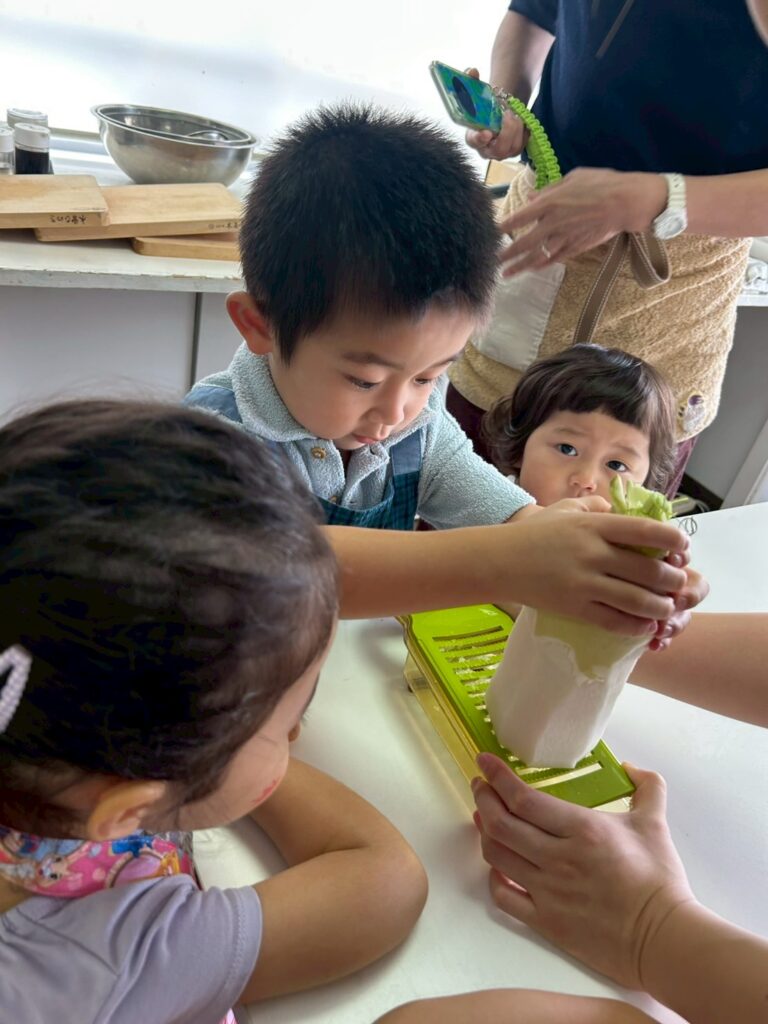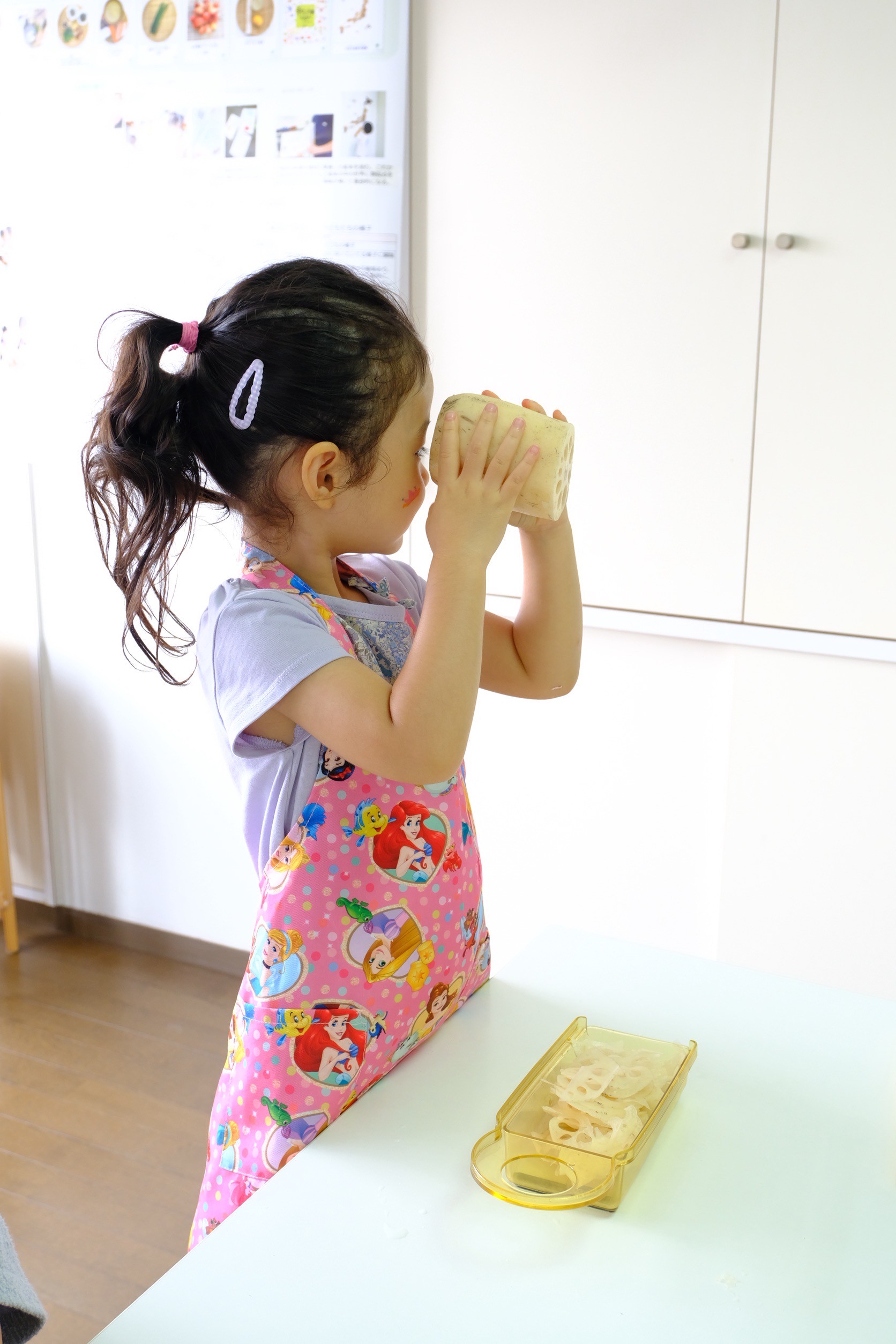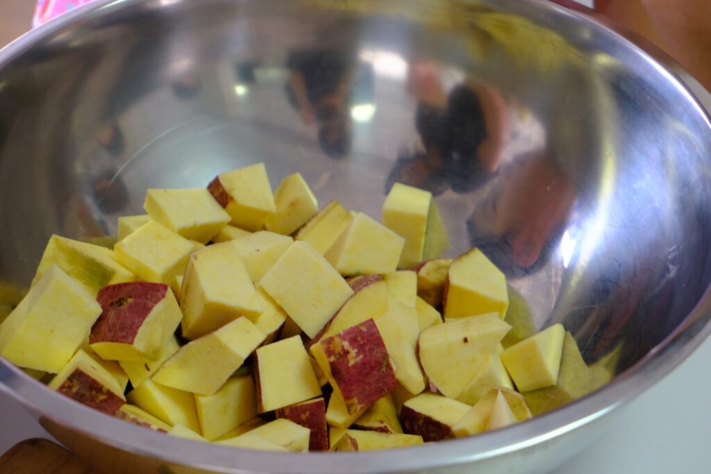 大学芋にする大きなさつまいもは切るのが難しそうでしたが、お兄さんが一人でたくさん切ってくれました。レンコンをスライサーで薄切りにする作業も「わたし蓮根が大好き!」とお姉さんが一人でやり切ってくれ、スムーズに作業が進みました。