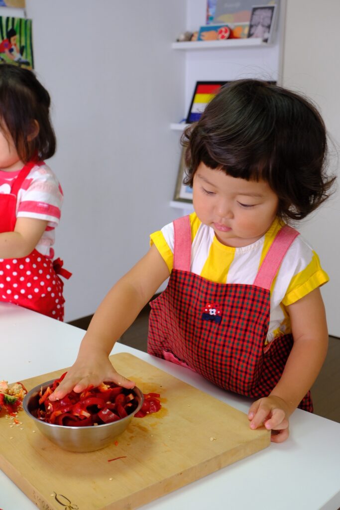 次は切る作業をします。さつまいもにレンコン、赤ピーマンの中からそれぞれが好きな野菜を選んで作業開始です。さつまいももレンコンもとても大きく、「大さつまいもだね」と言っている子もいました。