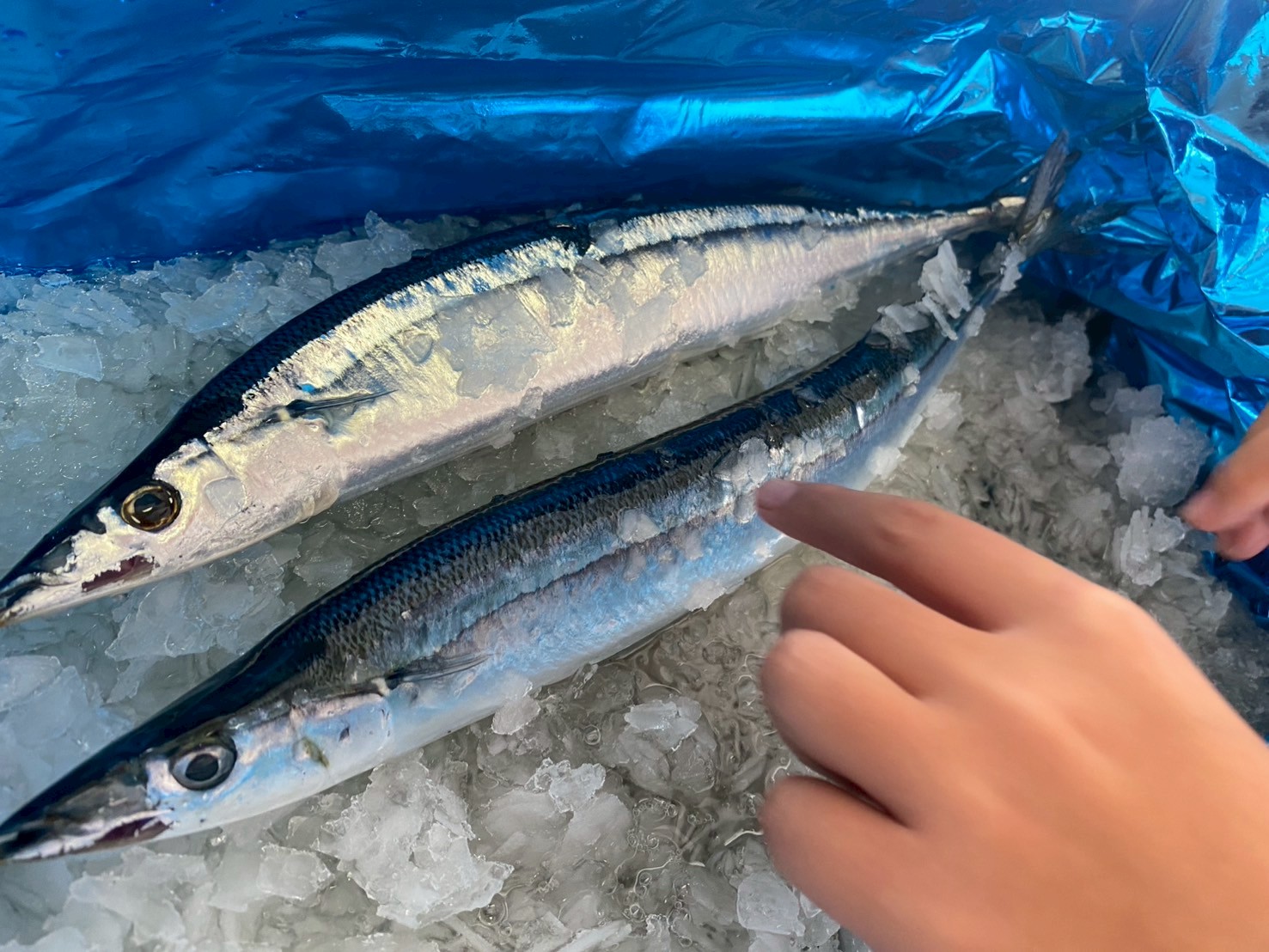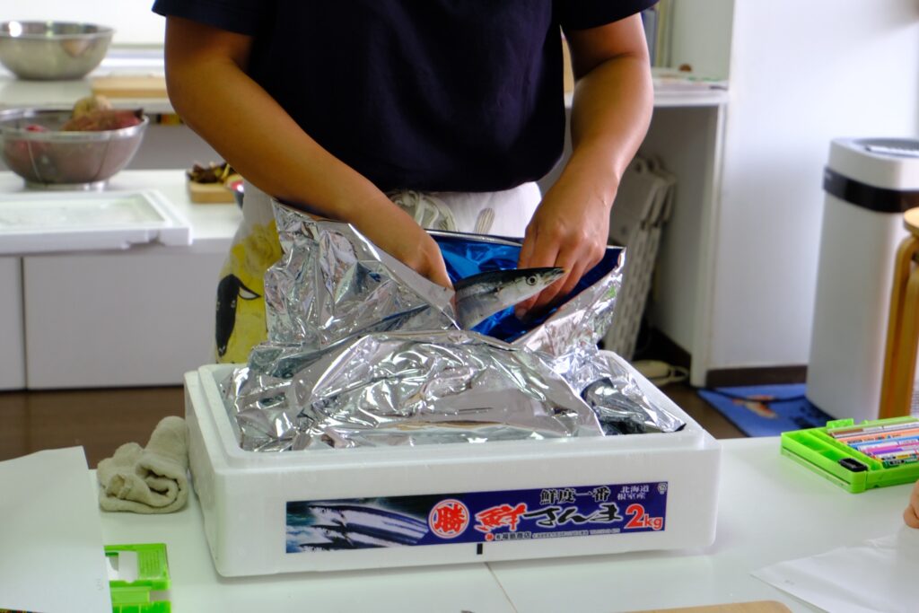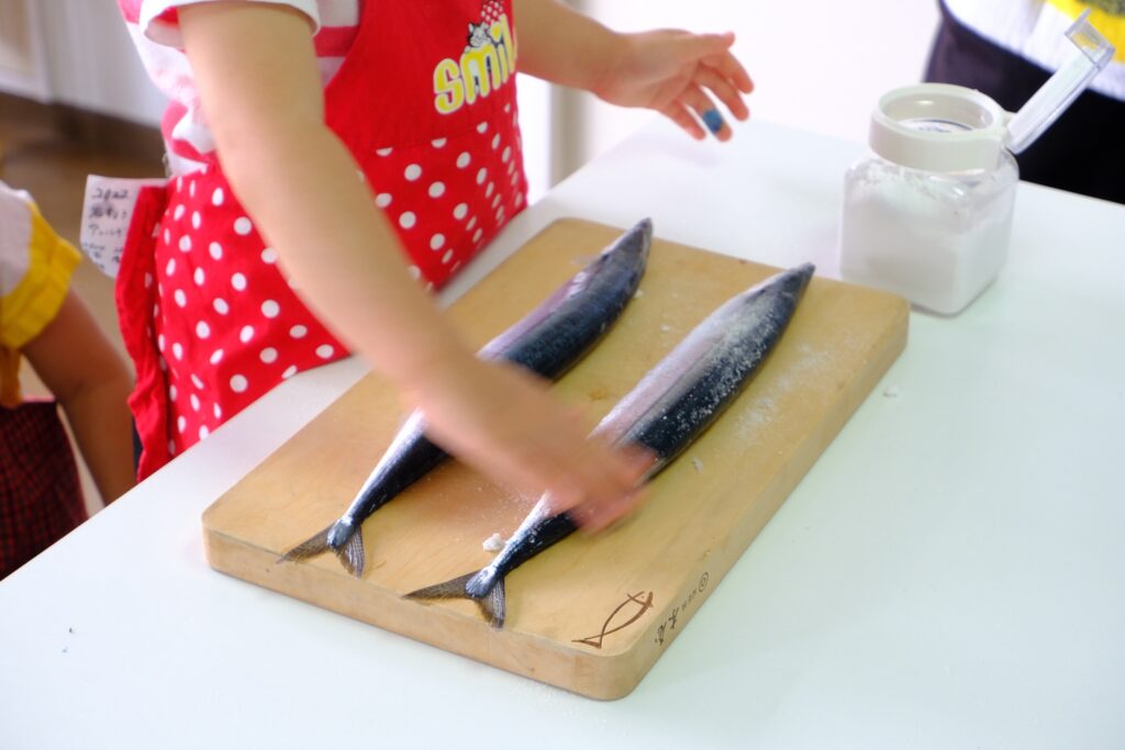 続いてもう一つの本日の主役、秋刀魚の登場です。魚市場からやってきた発砲スチロールに氷いっぱいの中からピンっと締まった秋刀魚が顔を出しました。ほとんど人の手に触れることなく、海からやってきた秋刀魚はとっても綺麗で子ども達も目が釘付けになっていました。今度は触る前に新鮮な秋刀魚の色や模様を観察してみます。くちばしが黄色いことや、色の濃い部分と薄い部分があることなど、色々なことを発見しながら色塗りをしました。光の加減で青や銀、黒に見えたり色が変わるので様々な方向からのぞき込んでいる子もいました。ようやく焼く準備に入ります。秋刀魚の表面はツルツルしていて、気持ちよさそうに触っている子もいました。その細長いからだの表面に塩をまぶしていきます。裏表両面に満遍なくまぶして、塩焼きの準備は万端です。