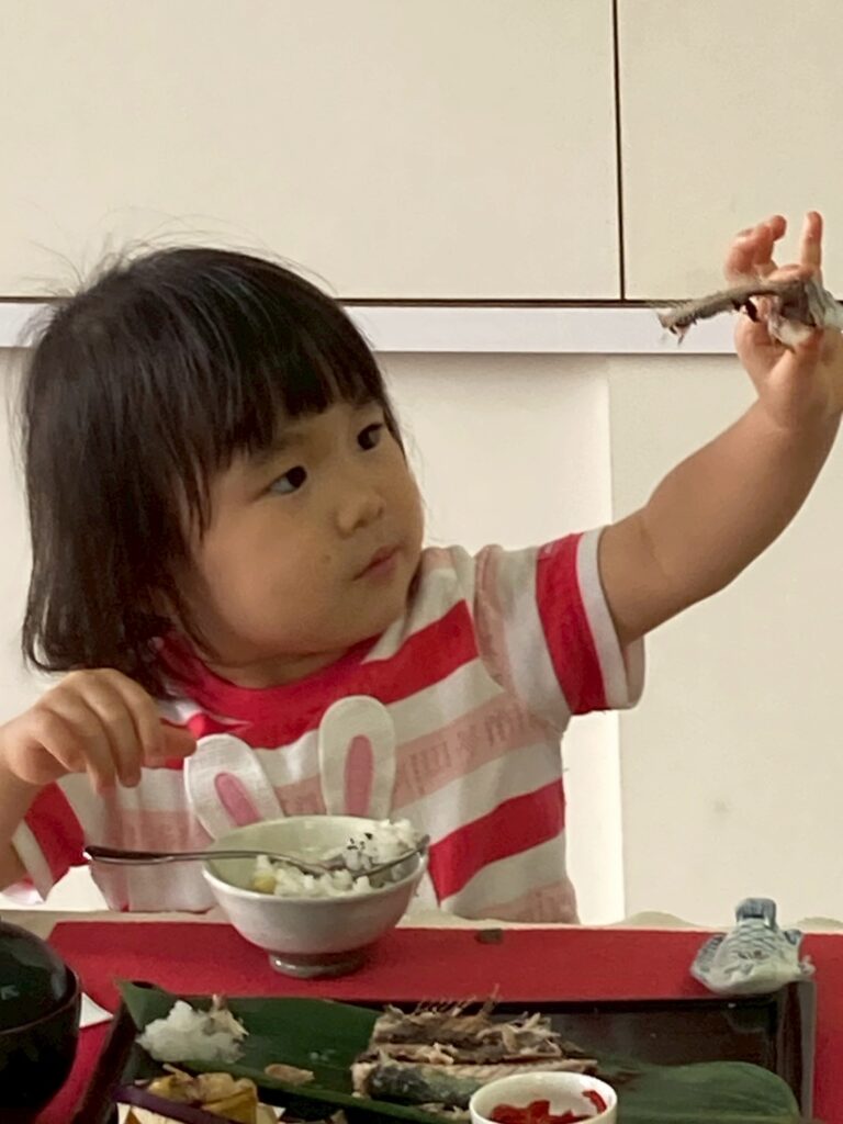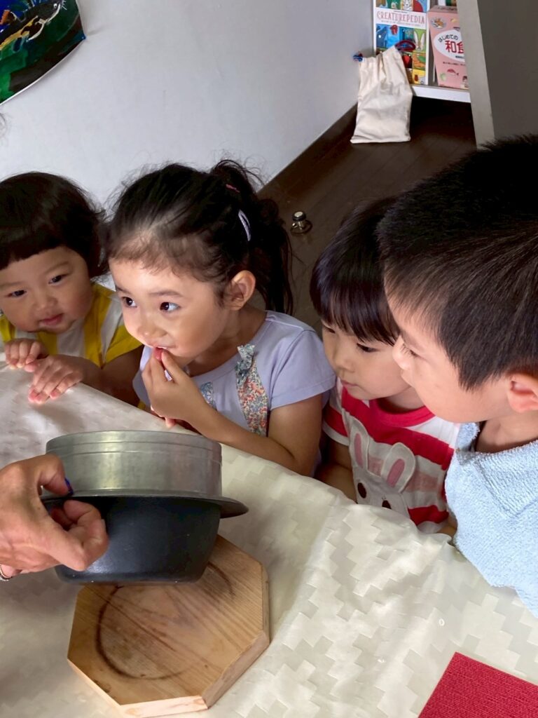 魚市場の絵本を読んで、今日の秋刀魚もこうやってここまで届いたのかななど想像しました。絵本の中にまさに目の前にあるのと同じような発泡スチロールの箱に入った秋刀魚の絵もあって、みんなで市場に遊びに入った気分になりました。絵本を読み終えると、さんまが焼ける香ばしい香りと栗ご飯のほんのり甘そうな香りが部屋いっぱいに広がっていました。お腹もペコペコなので配膳に取り掛かります。