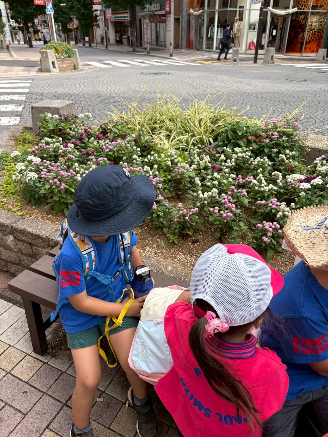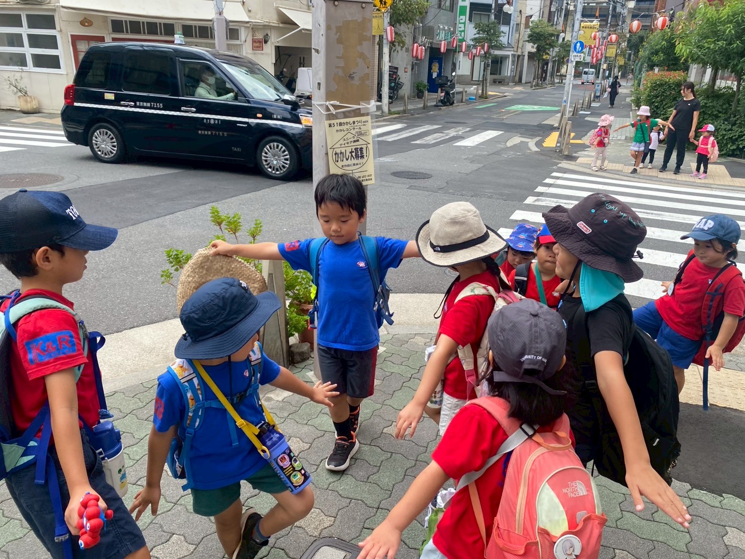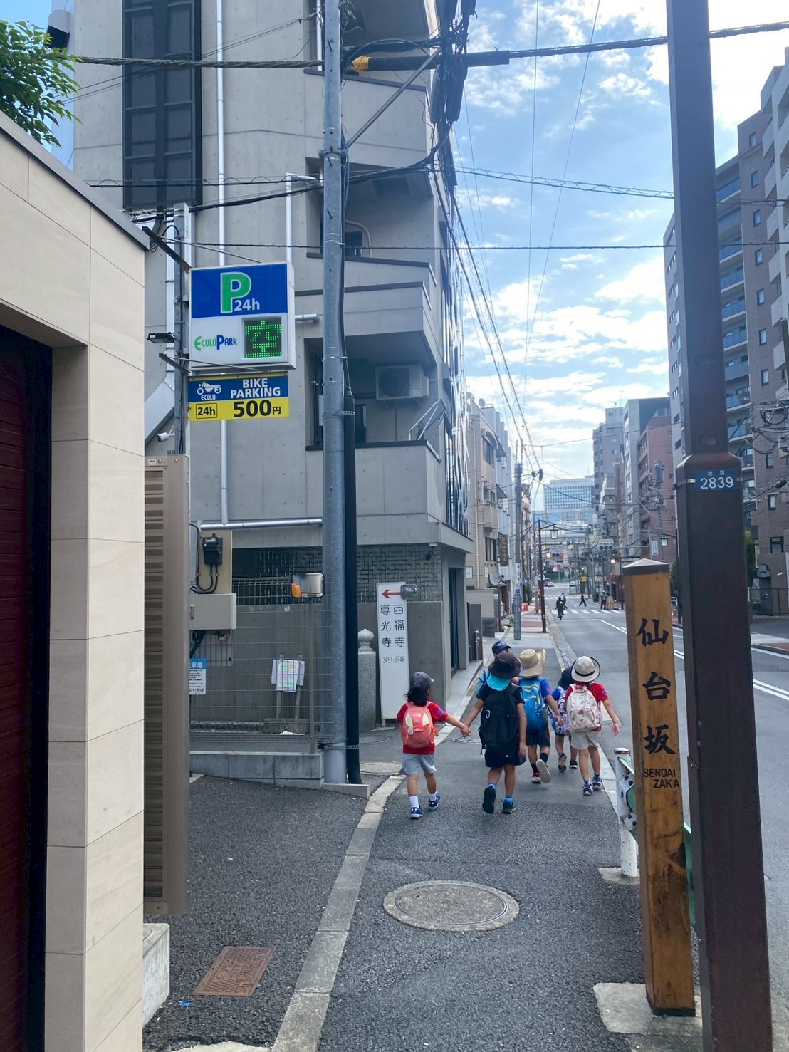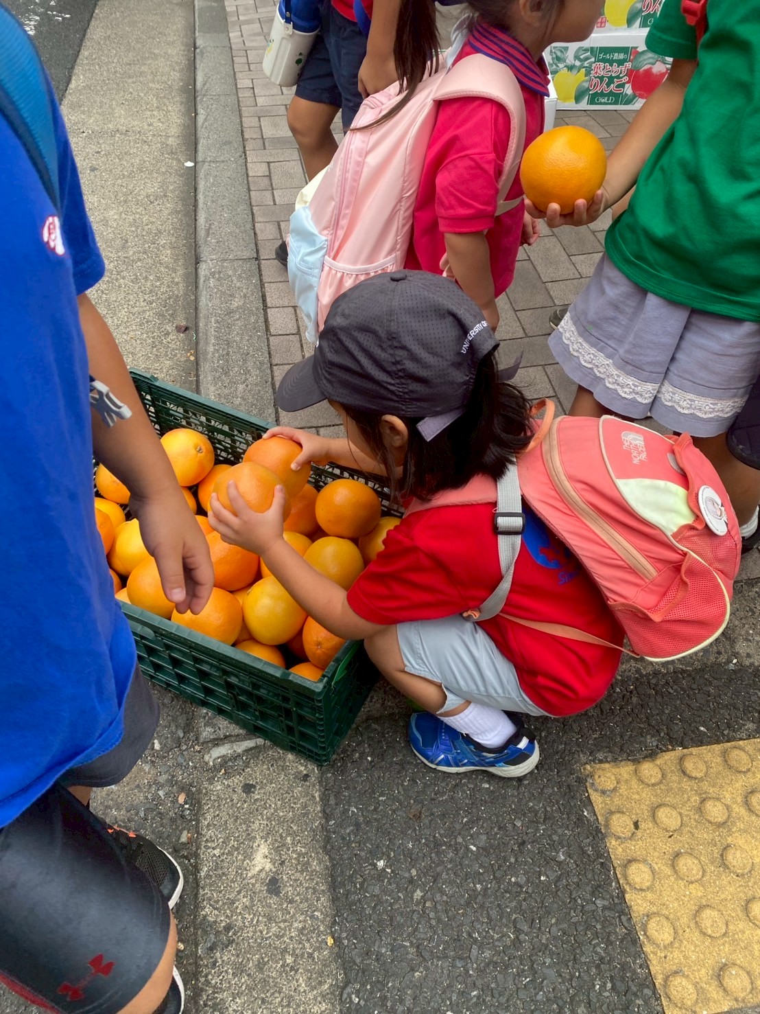 歩き進めていくと、八百屋さんを見つけたので、どのようなお野菜や果物が売られているかを見てみることにしました。林檎や梨、ぶどう、シャンマスカットが並ぶのをみて「秋らしくなってきたね」と話していると、横でゴロゴロゴロゴロ~!!と音がして、山積みだったグレープフルーツが転がり落ちてきました。みんなで協力して一つ残らずケースに入れました。お店屋さんに「ありがとう!助かったよ!」と御礼を言っていただき、役に立てたことに嬉しそうな子ども達は足取り軽やかに東京タワーに向かって再出発しました。