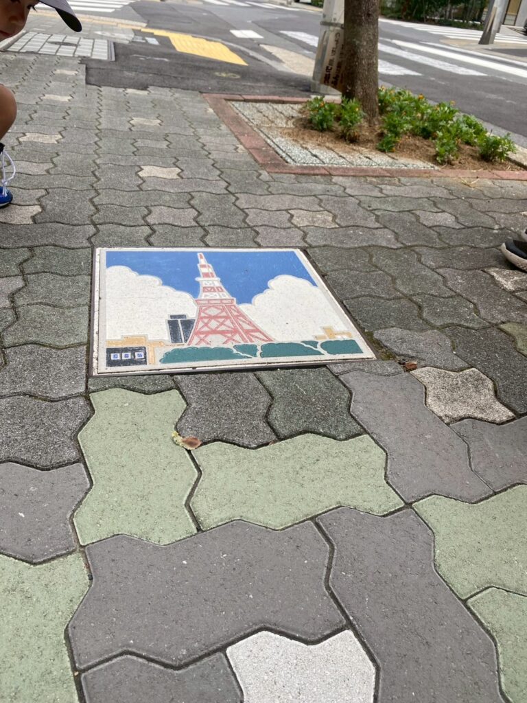 東京タワーを目指して歩いているはずが、ちょっと目を離すと東京タワーがいなくなっていることがあります。「東京タワーはどこにいった?」「また逃げられた!」と大きいはずの東京タワーが見えたり見えなかったりする不思議を感じつつ、見る度に大きくなっていく東京タワーに到着が近い予感を感じている様子でした。東京タワーに一番近い商店街は地面にも東京タワーが描いてありました。