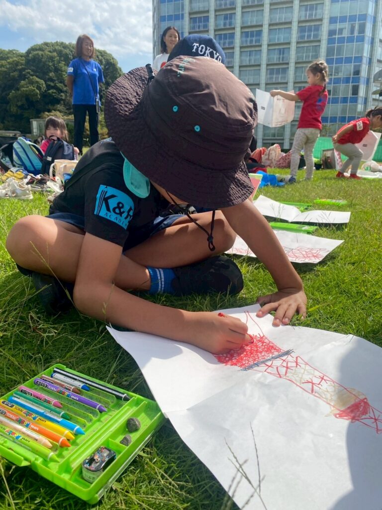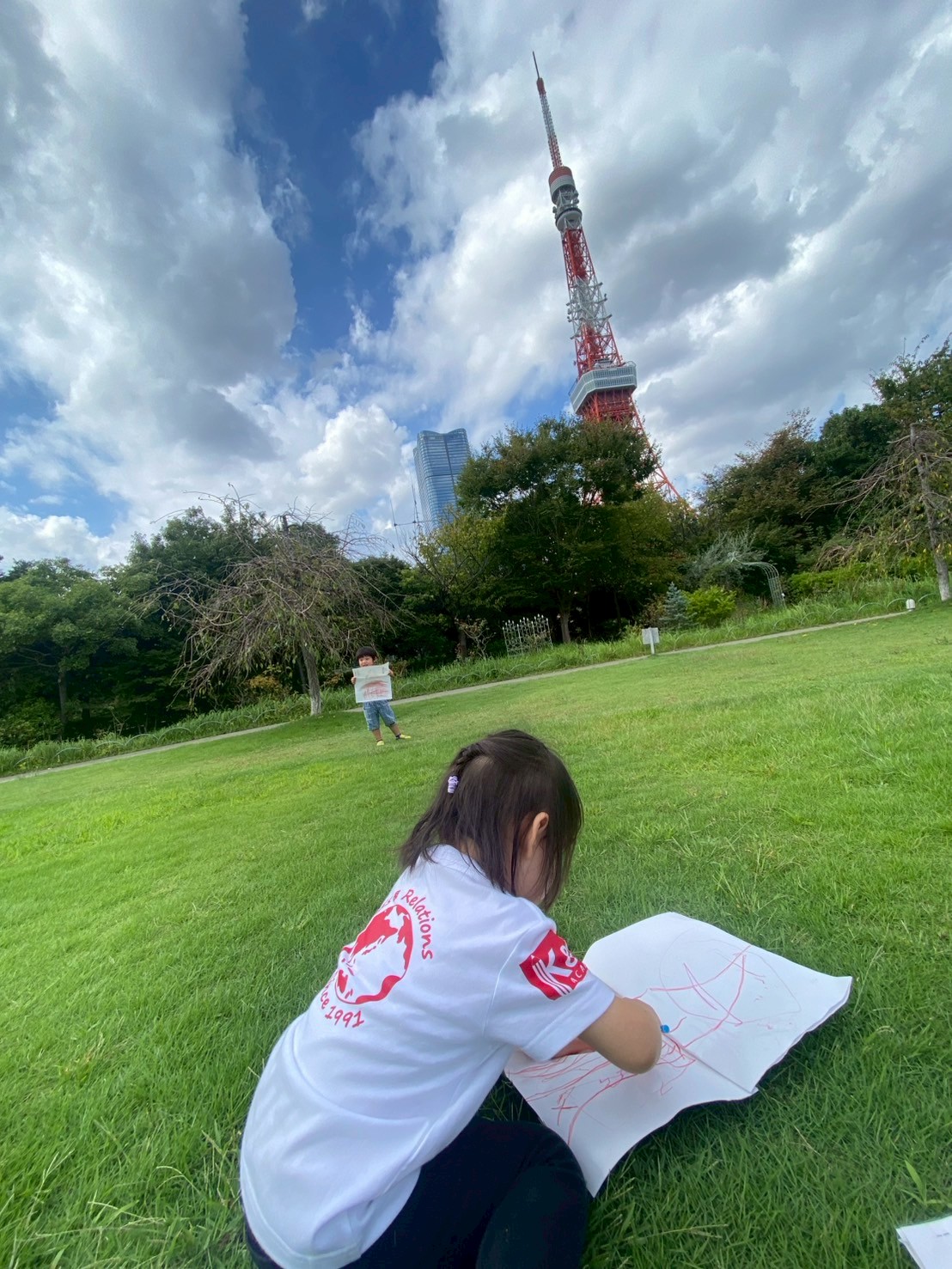 続いて芝生の上で、東京タワーの絵を描きます。階段をのぼりながらみた東京タワーの記憶と今見えている姿とを合わせながら夢中になってポンキーを動かす子たちが沢山いました。どの子も描きあがるととても満足がいった様子で東京タワーをバックに写真を撮りました。