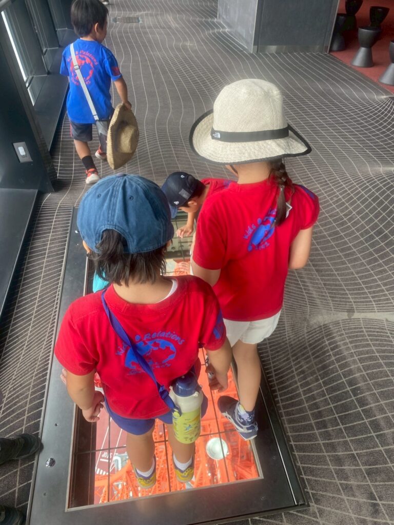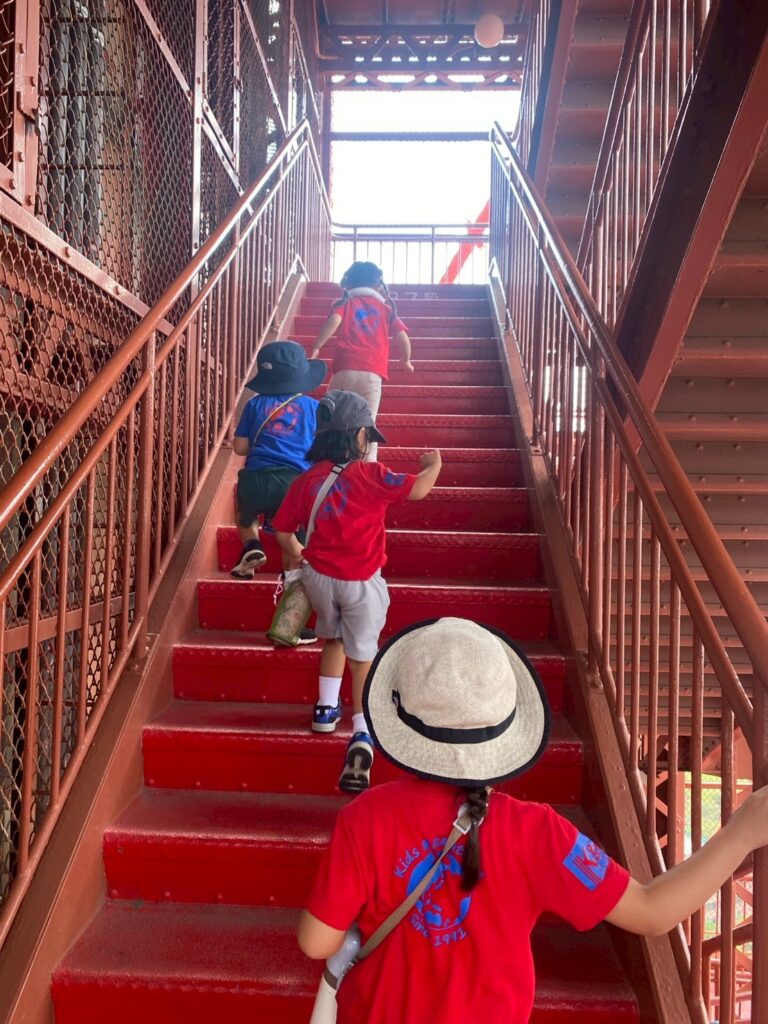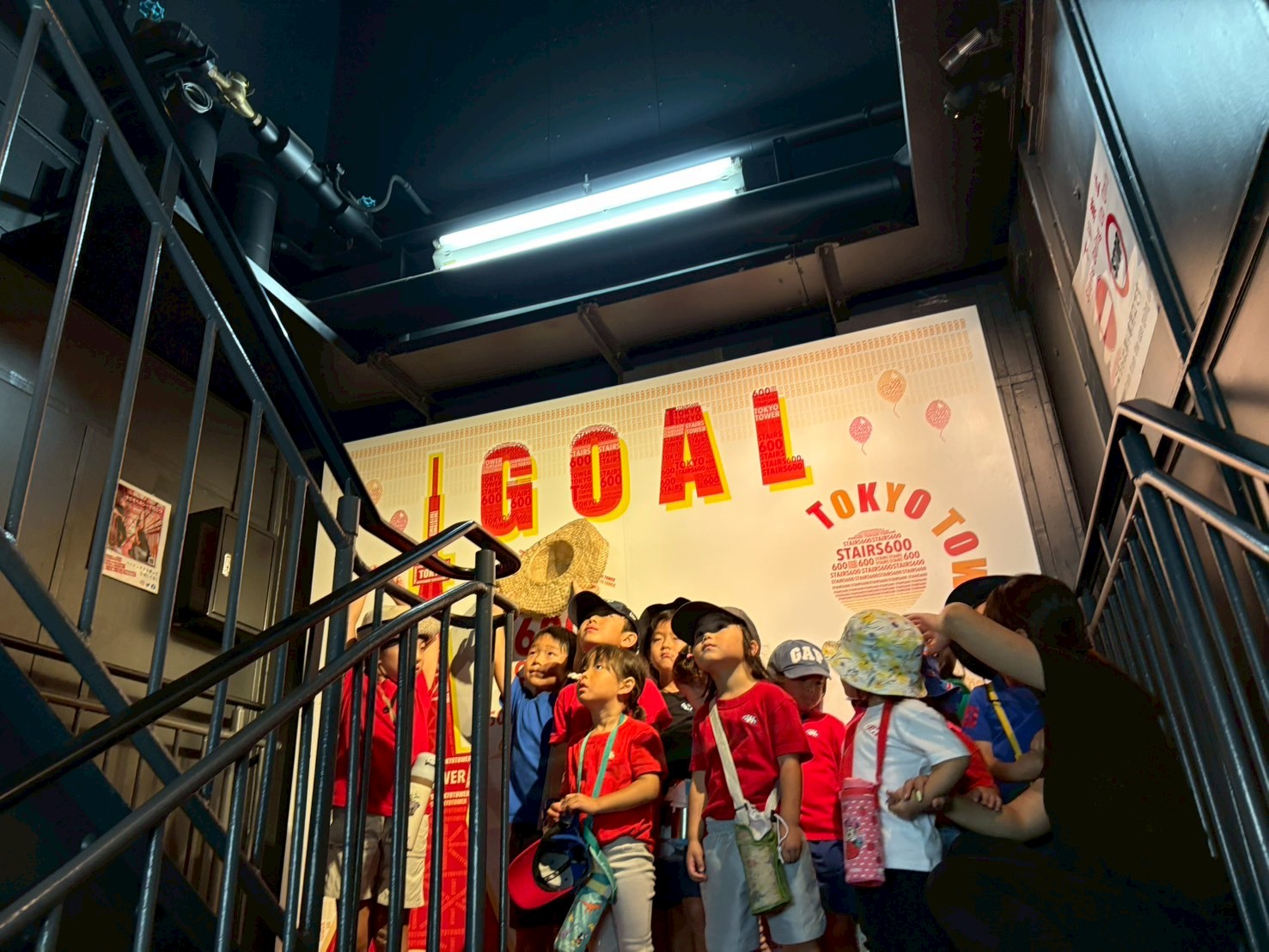さぁ、いよいよ600段の階段をのぼって東京タワーの展望台を目指します。入口のお姉さんに見送られてはじめの一歩を踏み出したら一段一段自分の足で上っていきます。とは言っても一人一人が黙々とのぼるのではなく、踊り場にある東京タワークイズも全員で予想をして正解に一喜一憂したり、階段に書いてある段数を先頭の子が後ろに伝えて応援したりと姿は見えなくても子ども達同士の声が飛び交っていて、お友達を思いやる優しさと余裕にお兄さんお姉さんたちの成長を感じました。一方のキンダーチームも想像を上回るペースで、途中集中力が切れることもなく驚かされました。みんなと一緒に行く!という気持ちの強さをパワーに変えているようでした。