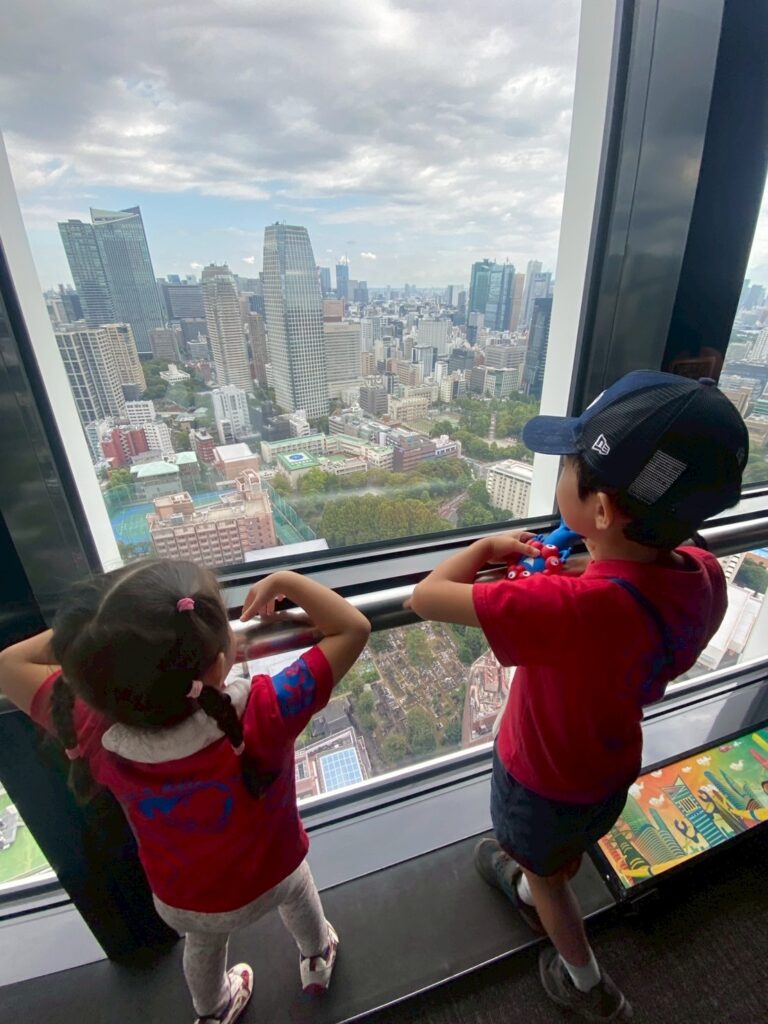 展望台に到着すると、東京の街並みが窓一面に広がっています。「人が小さいね」「サッカーしている人がいる」「広尾はどこかな?」「海が見える!」「さっき歩いてた時にみた建物だ」など同じ窓を見ていても切り取る景色は様々で、楽しさが倍増です。高速道路と道路が立体に交差しているところはまるでトミカの世界に飛び込んだようでした。