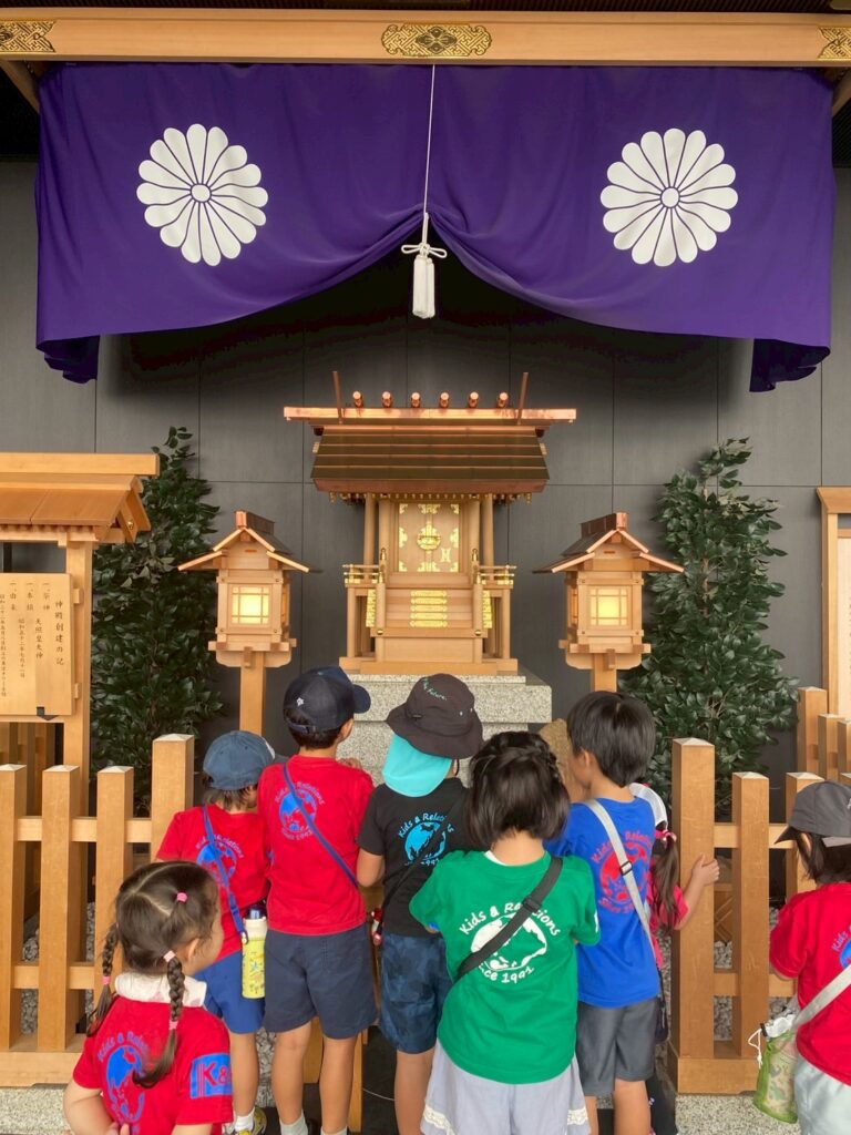 いつも幼稚園に行く時に歩く道!ここいつもお友達と遊ぶところ!とみんなが知っている道を5分ほど歩いていくと、東京タワーが見えてきました。その他ドイツ大使館や、韓国領事館、ハンガリー文化センターなどの前も通りました。ドイツ大使館の壁には、過去の万博で作られてドイツパビリオンの設計図が飾られており、夏休みに大阪万博に行った子たちは、いつどこで行われた万博の図かを興味津々に見ていました。万博は日本でだけではなく、世界の色々なところで開催されていたのを知ることができました。年長さんは国旗を覚えているので、国旗をみると、すぐにどこの国の建物かが分かるようになりました。
