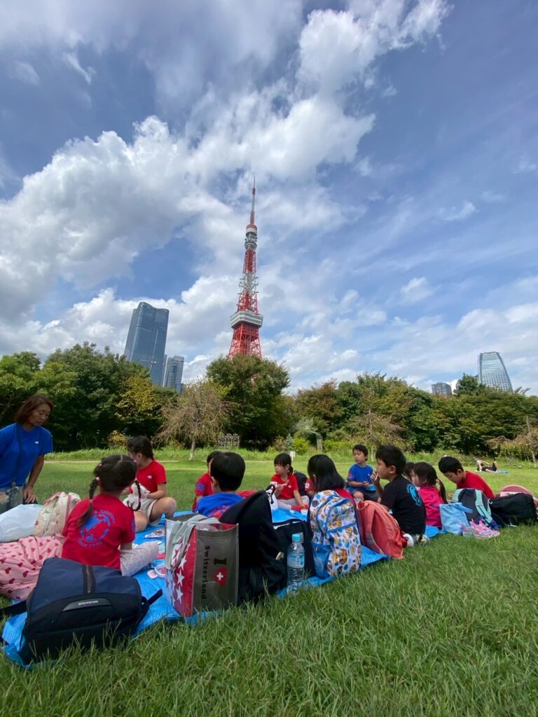 東京タワーからも見えた芝生の広場に移動し、ピクニックランチです。お腹が空きすぎて電池が切れかけていた子ども達、最後の力を振り絞って東京タワーがよく見えるところに場所を決め、いただきます!同じ場所に訪れることで記憶の引き出しが開いたようで、「去年は雨が降ってきたから木の下で食べたよね」「結婚式がやってたね」など一年前の遠足のことを思い出す子もいました。