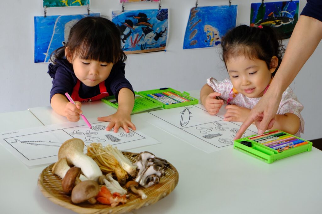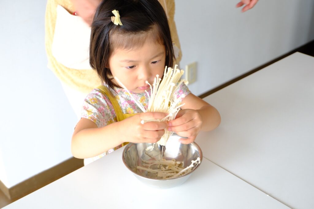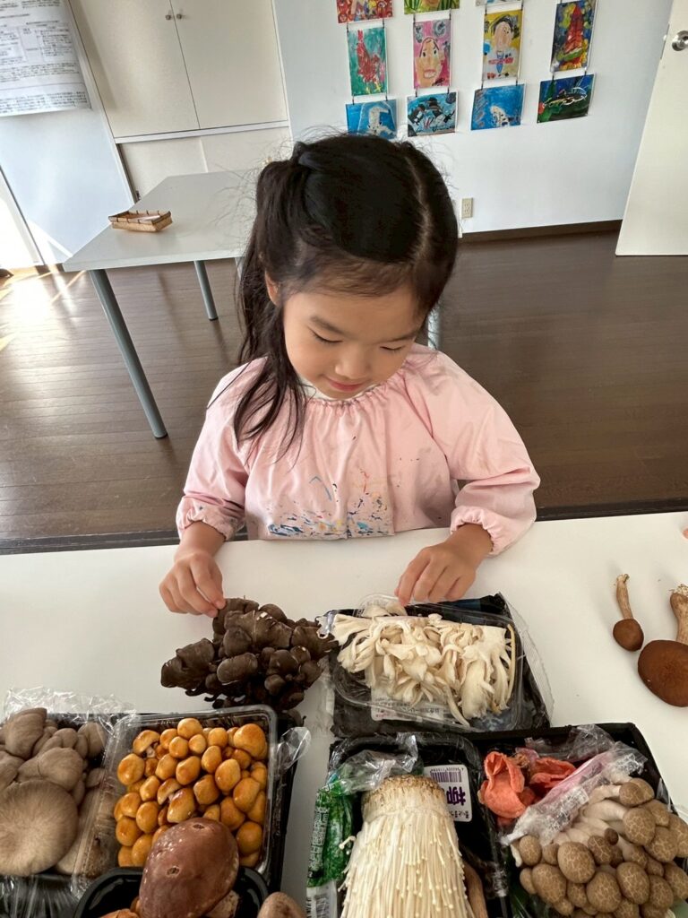 しいたけやえのき、しめじなどのきのこは知っている子が多かった一方、ひらたけや柳松茸、茶色のえのきやとき色のきのこなどはほとんどの子が初めて見たようでした。見たことがないきのこにみんな興味津々で、触ってみたり匂いを嗅いだり、傘を差すように持ってみたりとじっくり観察しました。観察した後は、きのこを手で割く作業をします。