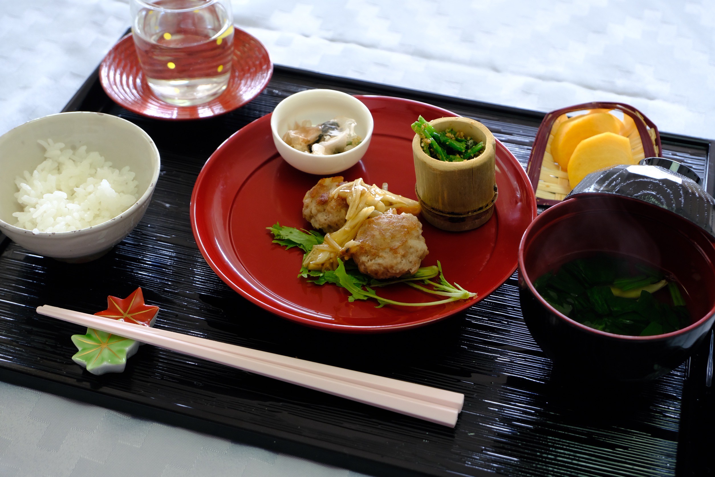秋コース4回目は、旬の色々な種類のきのこをたっぷり使って、和風ハンバーグ御膳を作りました。
