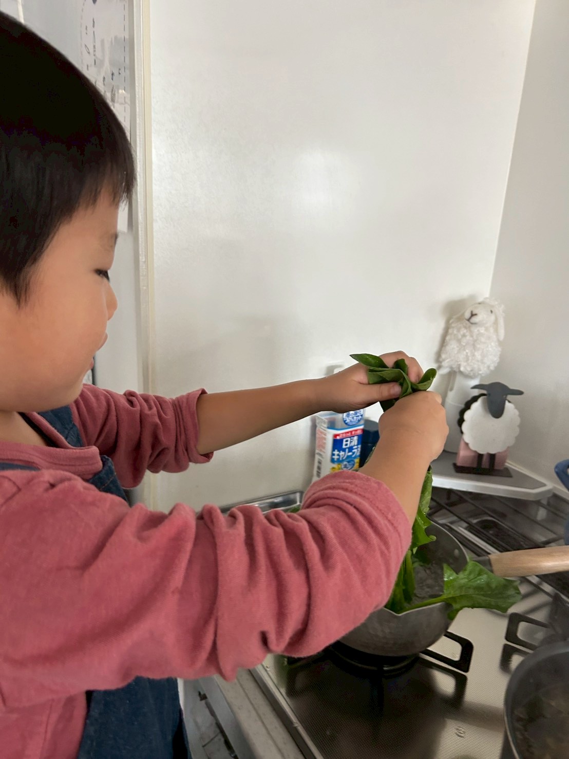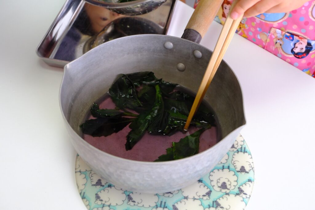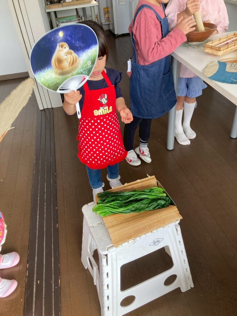 一方大きい子チームはその間にほうれん草を茹で、胡麻和えにするために胡麻をすってくれました。茹だったほうれん草を取り出し、うちわで冷ますのは小さい子たちの役目です。白い湯気が見えなくなるまで一生懸命扇ぎ、冷めたら水分を搾ります。搾って出てきた汁を見て、「緑色だね」と教えてくれた子がいたので、その後に茹でた金時草の茹で汁と見比べてみました。金時草は茹でる前は片面が紫色、もう片面が緑色ですが、茹でると葉は緑色になり、茹で汁が紫色になります。同じ葉物でも全く色が違い、みんな興味深そうに見ていました。