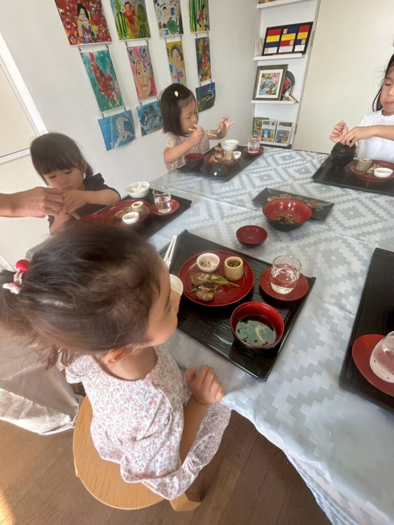 きのこの絵本を読み終わる頃には、ハンバーグが焼ける良い匂いが部屋中に漂っていました。早く食べたい気持ちを我慢しながら、配膳に取り掛かります。料理が盛り付けられた器を順番に運び、正しい位置に並べていきました。全部の準備が整ったら、みんなで手を合わせて「いただきます!」見たこともないきのこがたくさんありましたが、あんかけにしてハンバーグにかけると、みんな美味しそうに食べていました。ハンバーグや胡麻和えが特に大好評で、おかわりをする子も多く、旬の味を存分に楽しむことができました。