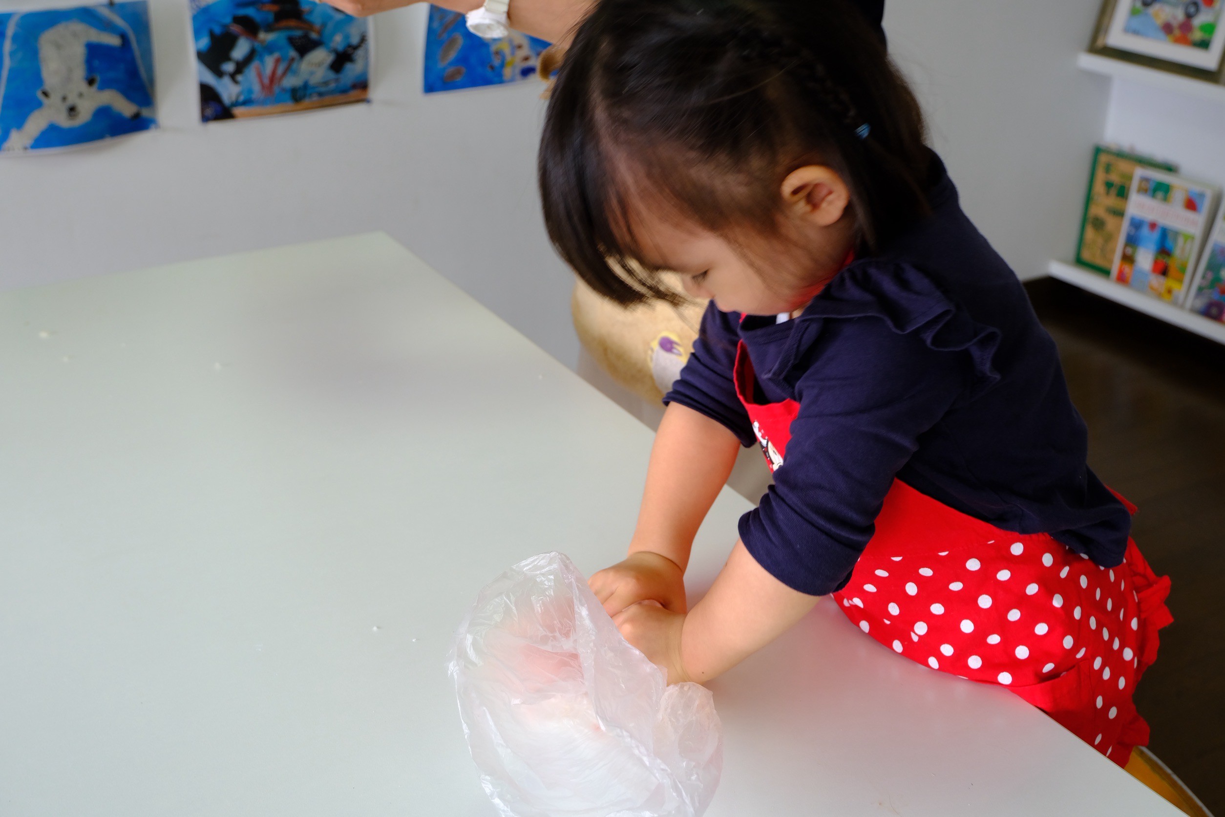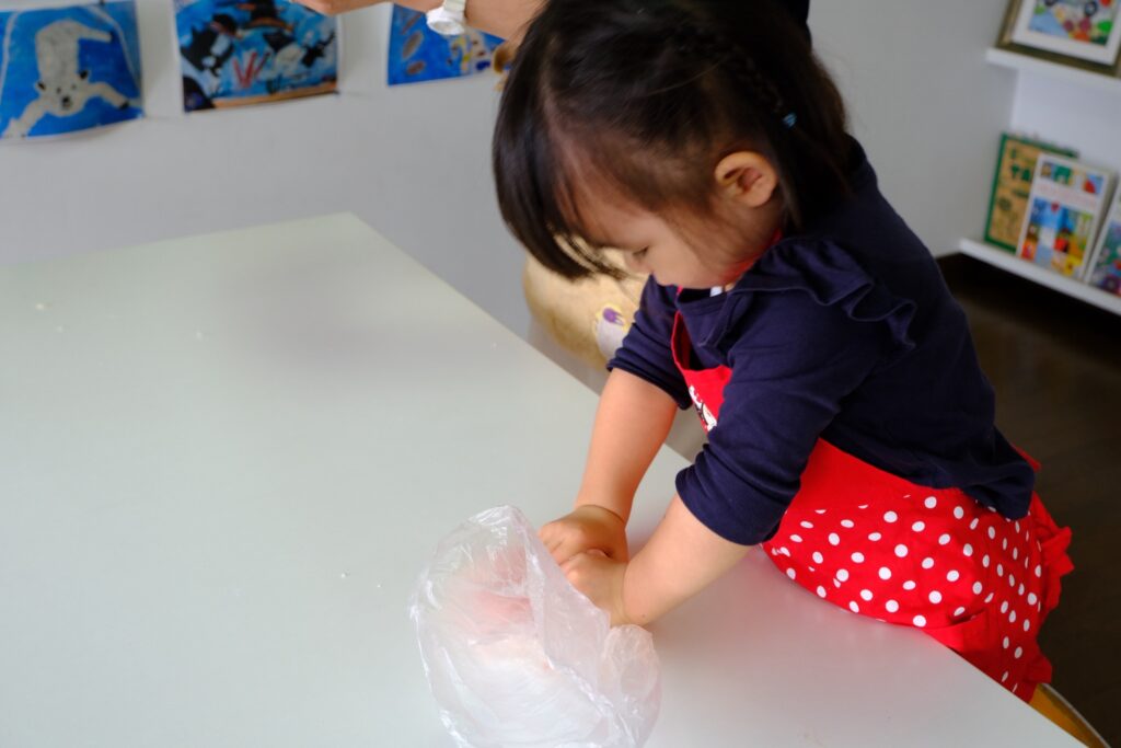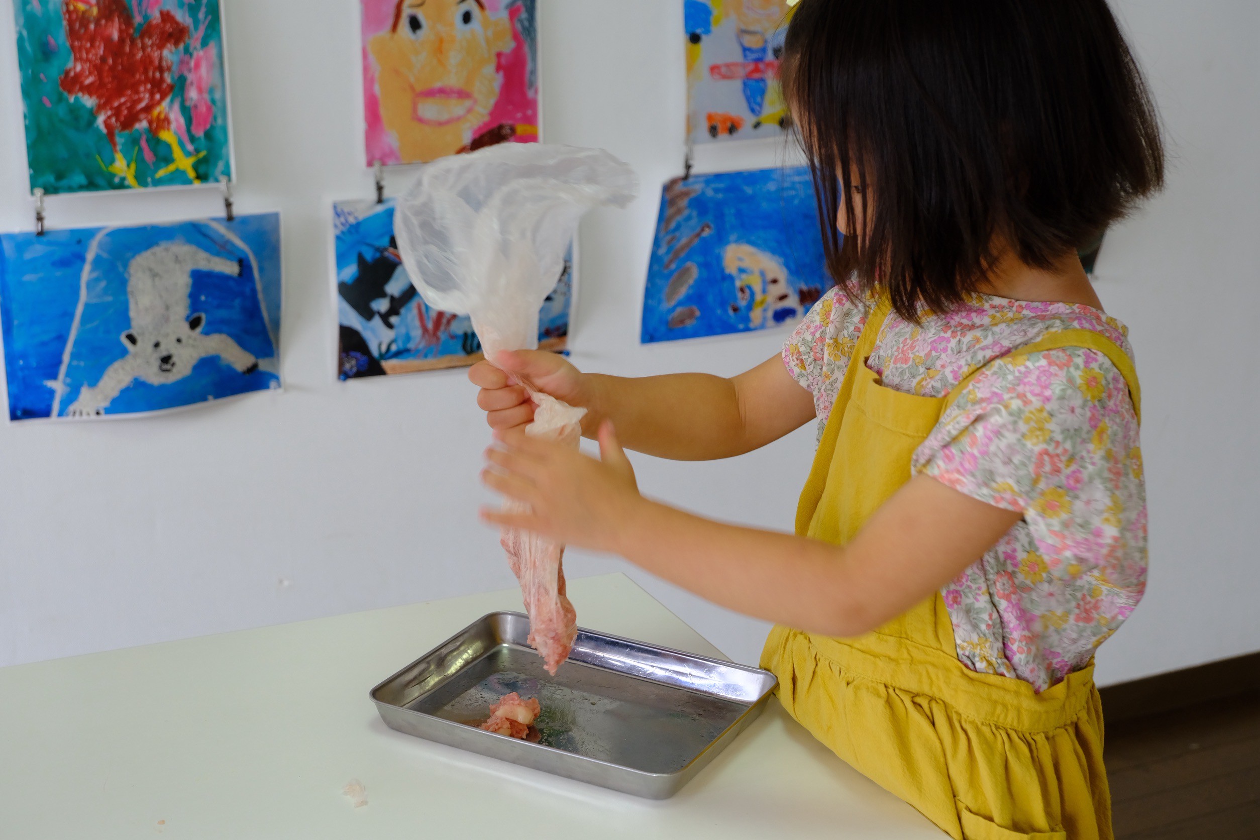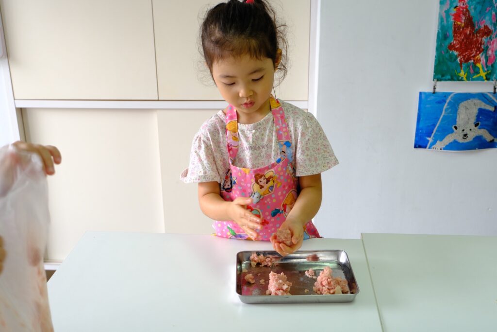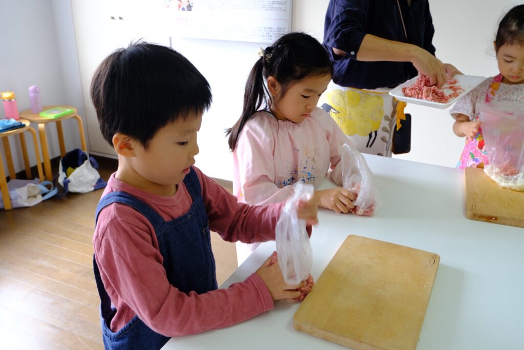 最初にお兄さんとお姉さんが切ってくれたレンコンを、1人1つずつ袋に入れて上から麺棒で叩いて潰しました。「まずお兄さんとお姉さんが見本をやるから、よく見ていてね」と言うと、小さい子たちもしっかり見てくれて、スムーズに作業が進みました。麺棒は全員分なく交代で使っていたのですが、待っている間に肘で潰すことを思いついた子もいて、工夫をしながら楽しそうにやっていました。レンコンが潰れたら、今度は袋の中にひき肉を入れて揉んでいきます。レンコンの白とお肉の赤色が綺麗に混ざるように揉んでねと伝え、それぞれが自分の分をよく見ながら揉んだら、ハンバーグを焼く準備ができました。