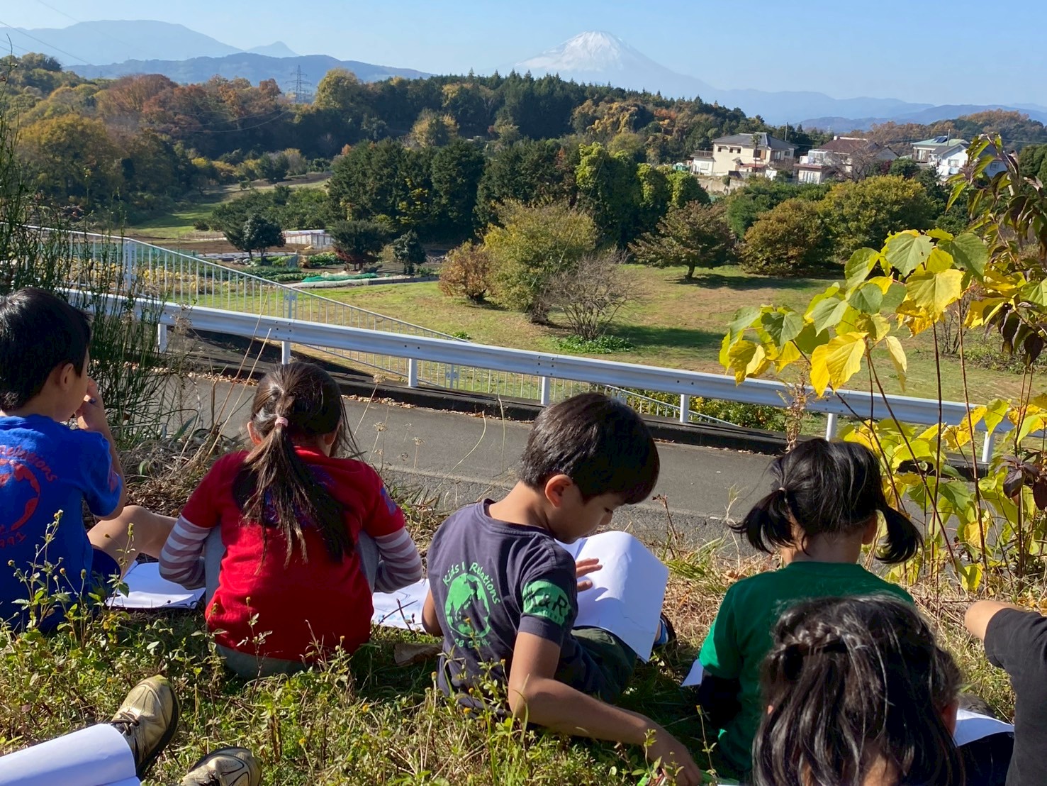 今日は天気が良く、富士山がとても綺麗に見えたため、よく見える広場に移動し、富士山の絵を描きました。