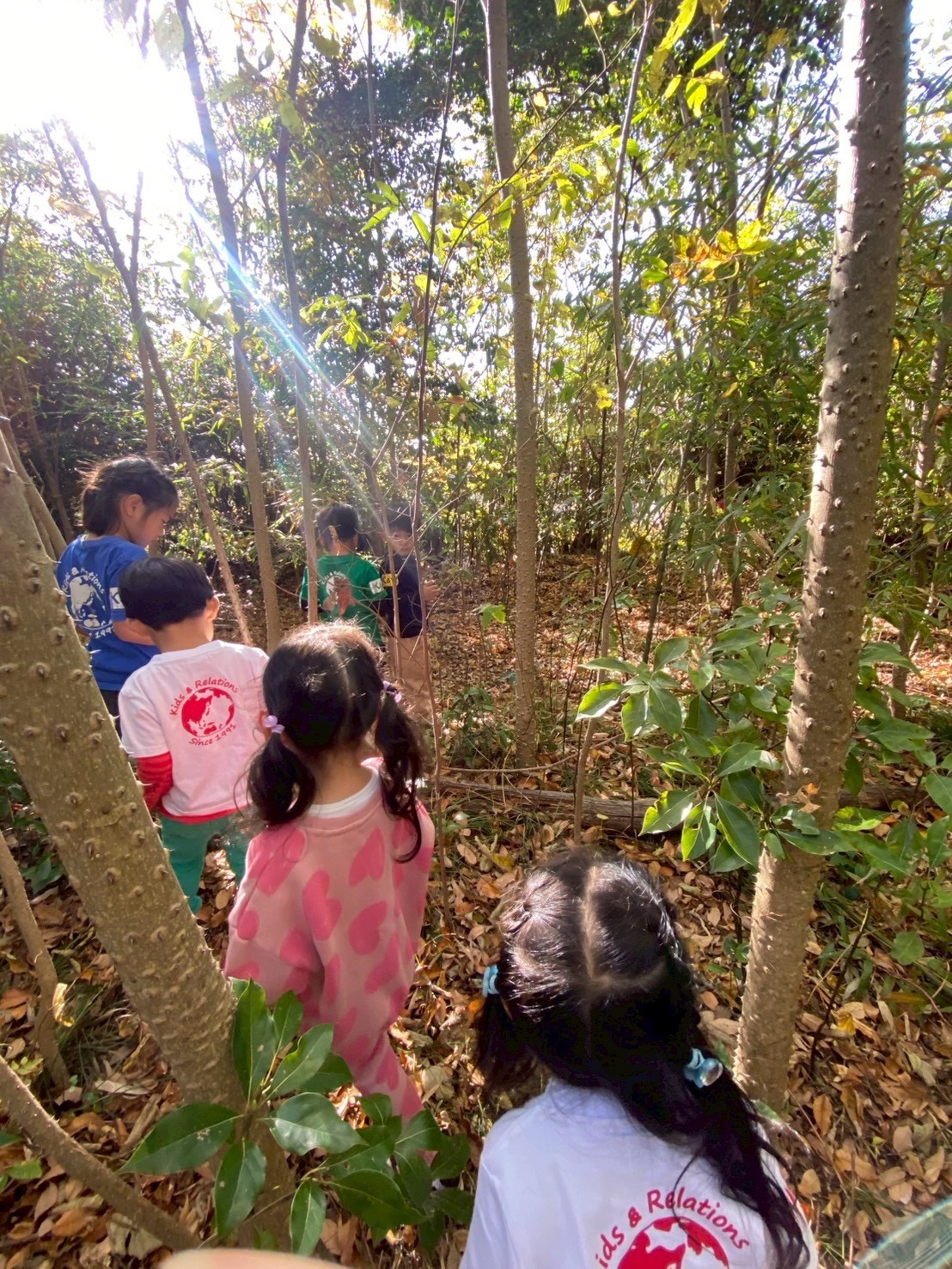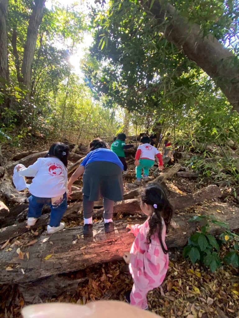絵を描き終えると、探検に出かけます!森の中へみんなで探検に行きました。足場が悪く、木がたくさん生えていて、中腰になったり潜ったりおっきい木を乗り越えたりアスレチックのようにみんな楽しみました。