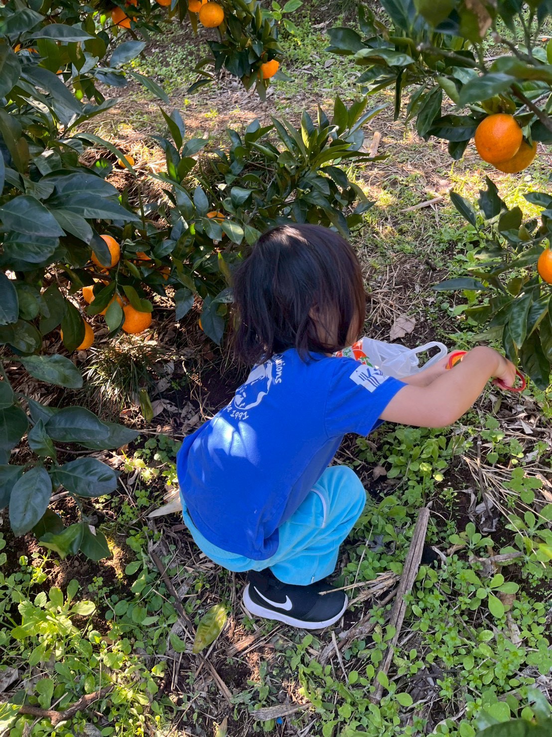 大磯みどり園に着くとビニール袋をいただき、早速みかん狩りが始まります。みかん狩りははさみでみかんの枝を切って木から切り離した後、ヘタまでの枝をギリギリまで切ります。それは、枝が袋や他のみかんを傷つけないようにするためであると教えていただきました。また、緑のものはまだ酸っぱいので綺麗なオレンジ色のものを探して食べてねとも教えていただきました。みんな思い思い、自分の食べたいみかんを見つけては取ったり食べたりしていきます。ビニール袋がいっぱいになったら自分の持ってきた袋に入れに行くという行動を何度も繰り返しました。家族にお土産を持って帰れることを嬉しそうにしていました。また、気をつけていないといっぱい取ってもみかんが袋から落ち、ころころ転がってしまいます。みかんを取ることにも、取ったみかんにも気を遣いながらたくさん取りました。