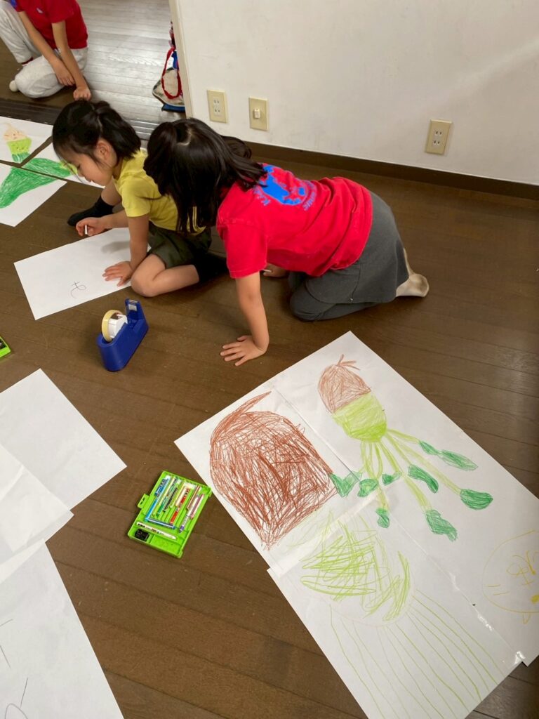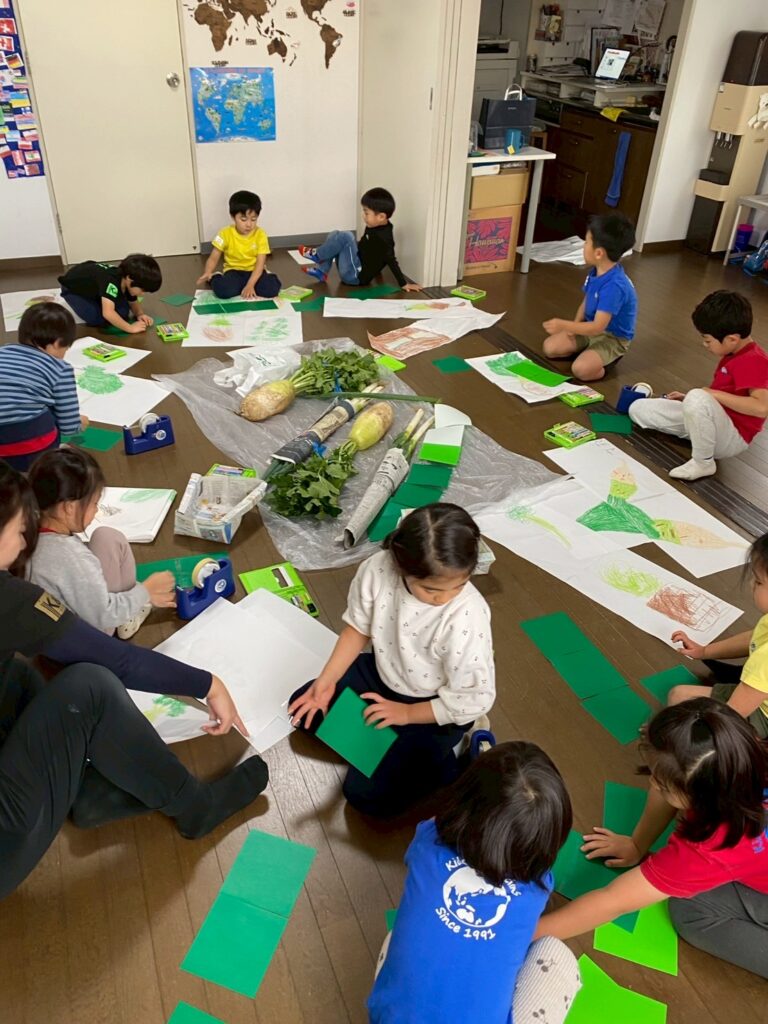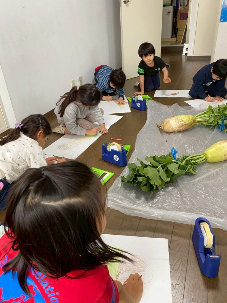 みんなのお顔よりも大きくて太い大根だね!と声をかけると、描いた大根と自分の顔を比べてみる姿もありました。この葉っぱも食べれるの?苦い味がするのかな?こんなに大きい大根どうやって食べるの?と大根のことを一生懸命考えながら描いていたので、とても美味しそうな大根の絵に仕上がりました。みんなが描いた絵が床にあると、お部屋がまるで午前中までいた畑のようになりました。