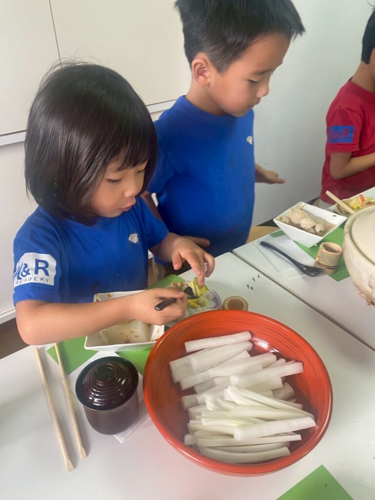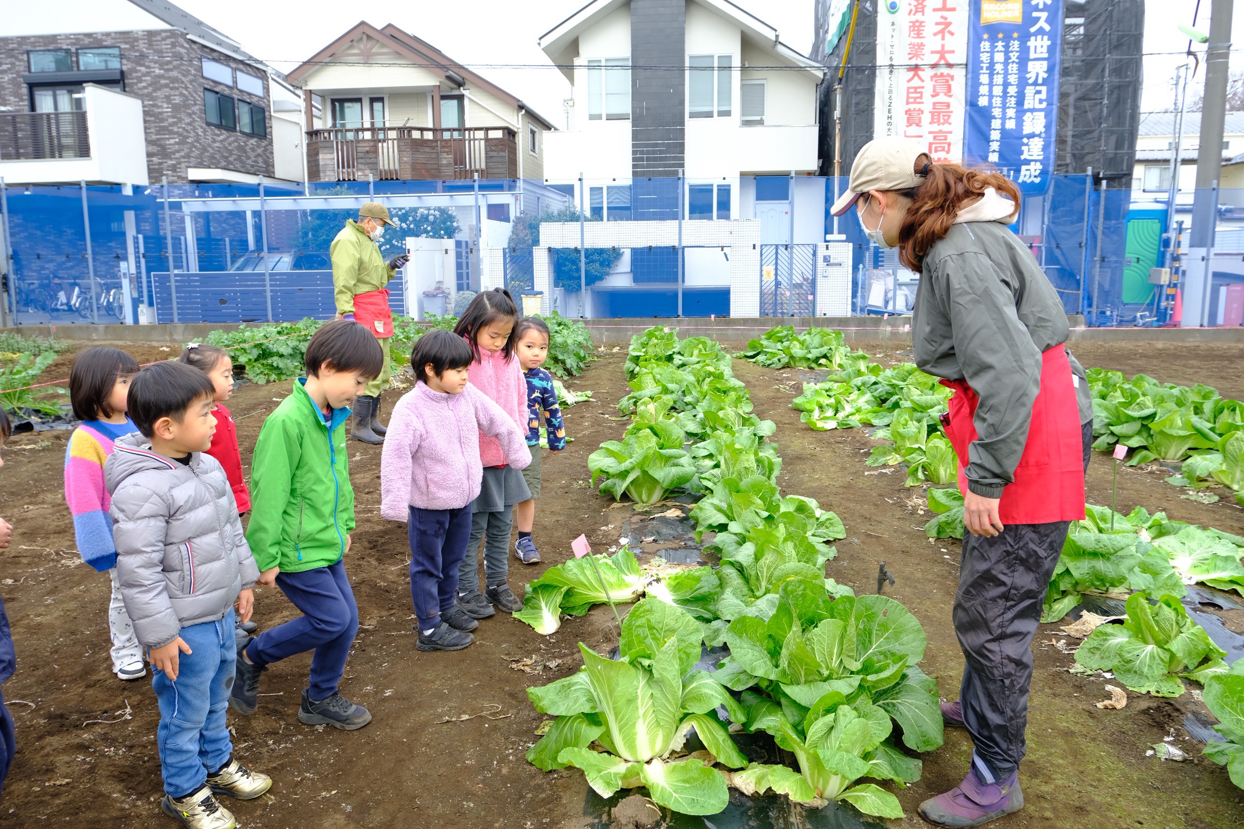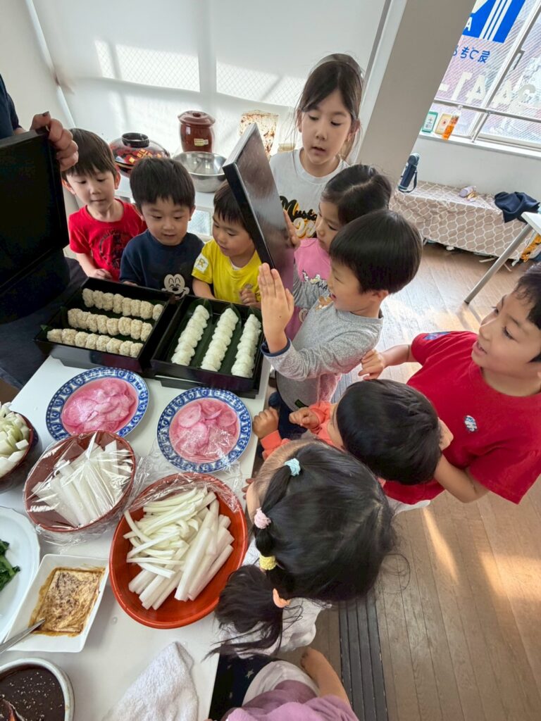 とれたての白菜や大根をたっぷり使ったお料理を、みんな「美味しい!」と言いながら食べていました。生のままスティック状に切ったものやスライスしただけのものを気に入って何度もおかわりしている子が多かったので、新鮮でみずみずしい野菜の美味しさが子どもたちにも分かったようです。