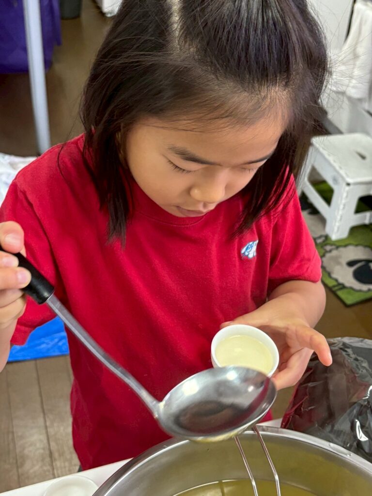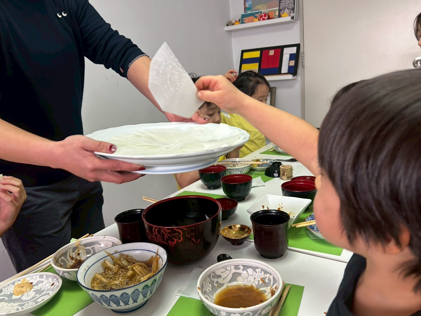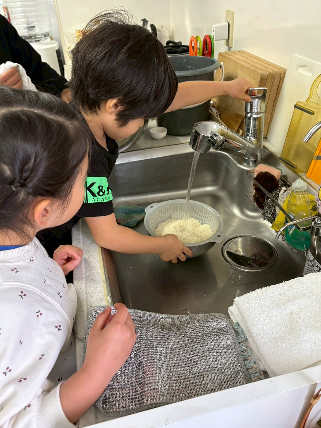 いつものお出汁取りと、お米を研ぐ作業は、朝早くから来ていた新1年生が中心となって出発前にひと働きしてくれました。15合ものお米をせっせと研ぎ、お出汁の取り方を初めての子に教えてあげる姿はすっかりお料理名人です。