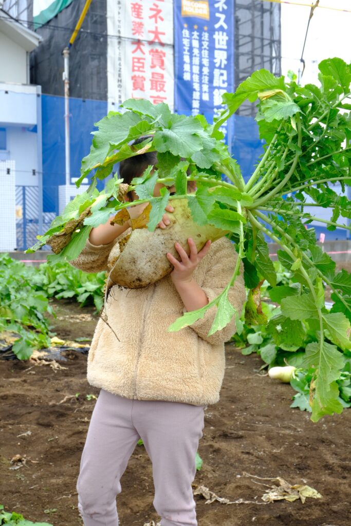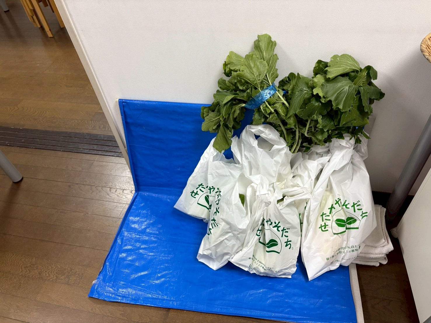 農園を時間差で出発した後発隊のみんなは収穫した大きな大根、白菜、ねぎをどのように調理して食べたら美味しいかお話しながら帰りました。お鍋、すき焼き、おでん‥‥お腹が空いていたので、頭にはたくさんお料理が浮かんできました。