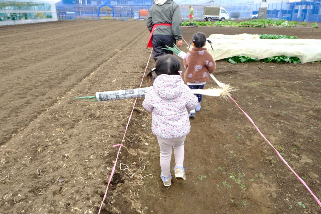 最後に、長ねぎです。ネギは、前に倒すように引っ張ると折れてしまうため、上に引っ張ることを意識して収穫しました。抜けたら、農家の方にネギの葉っぱの部分を新聞紙で包んでもらい、袋に入れました。