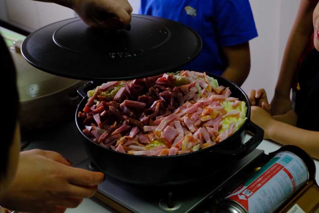 収穫から帰ってきた子供たちはもうお腹がペコペコで、食べるのが待ちきれません。良い匂いがする台所の方へ集まっていく子や、並べられたたくさんのお料理を見て「すごい!」「美味しそう!」と目を輝かせている子もいました。自分の食べる分の配膳をして、白菜のミルフィーユ鍋にみんなでベーコンを入れて火にかけたら、待ち望んだ食事の時間です。