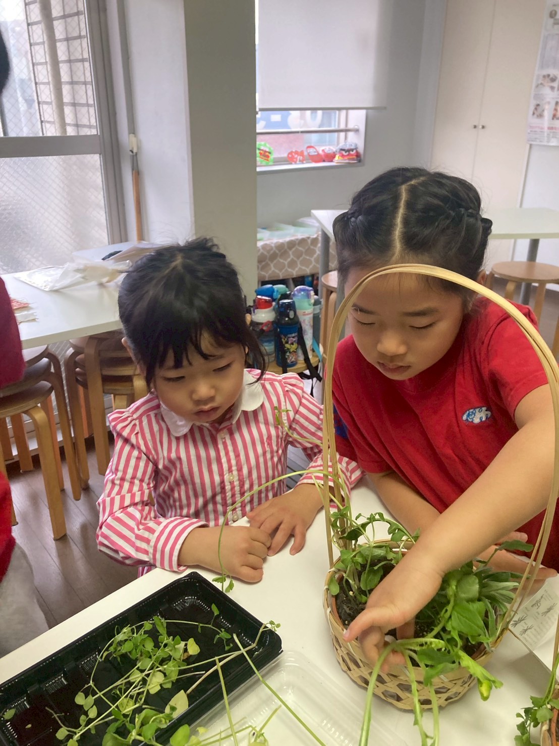 3つの異なる県からやってきた七草を持ってきてくれた子がいたので、みんなで七草の籠盛りを作ってみることにしました。同じ七草でもひとつひとつ取り出してみると、根っこまで立派な長い芹が入っていたり、御形が大きかったりと違いをたくさん見つけることが出来ました。