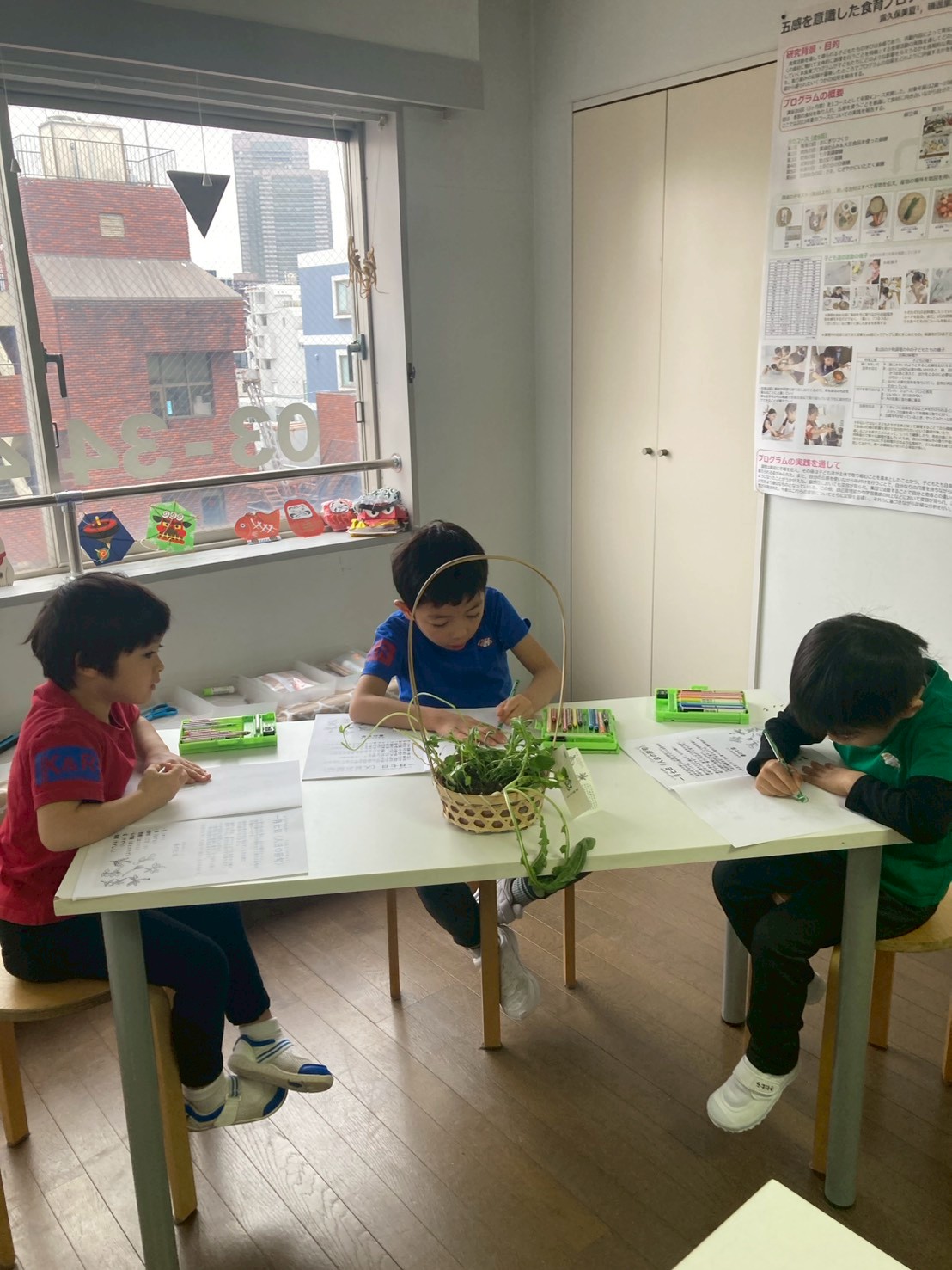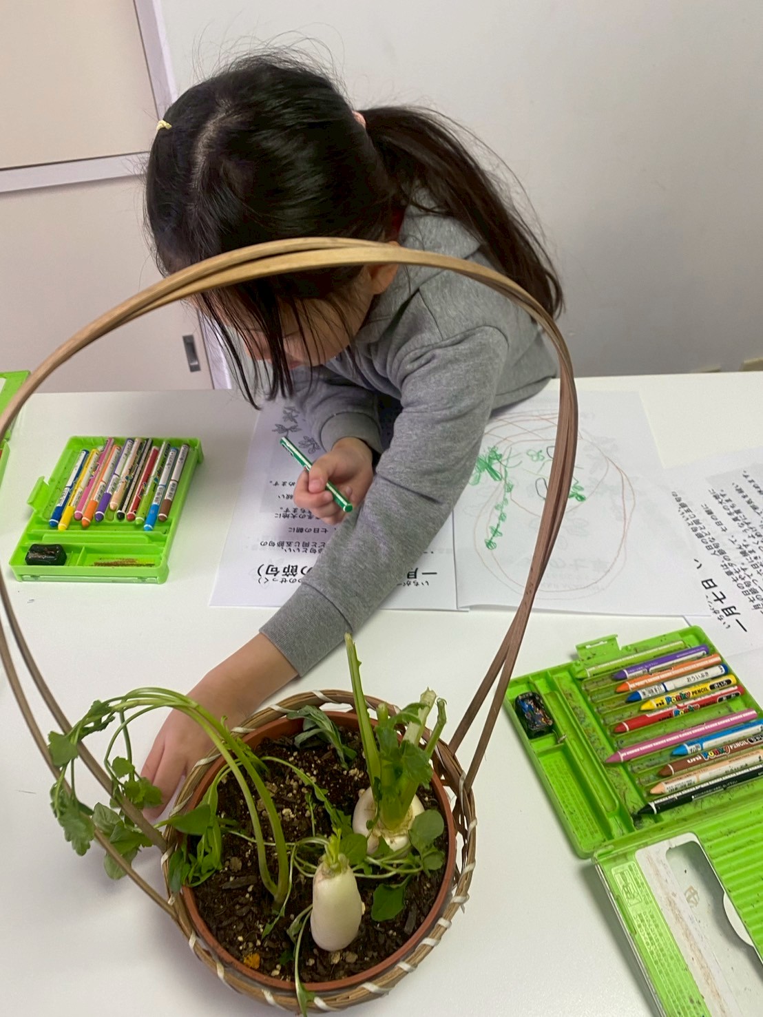 七草は、名前を聞いたことがある子も多い食材ですが、葉の違いまでじっくり見る機会はあまりありません。大根やかぶは見分けがつき、みんな分かりましたが、その他は見たことや食べたことがない葉でした。ですが、実際に見て、描いてみることで、あまり知らなかった七草が身近な存在になり、改めて七草を知る機会となりました。