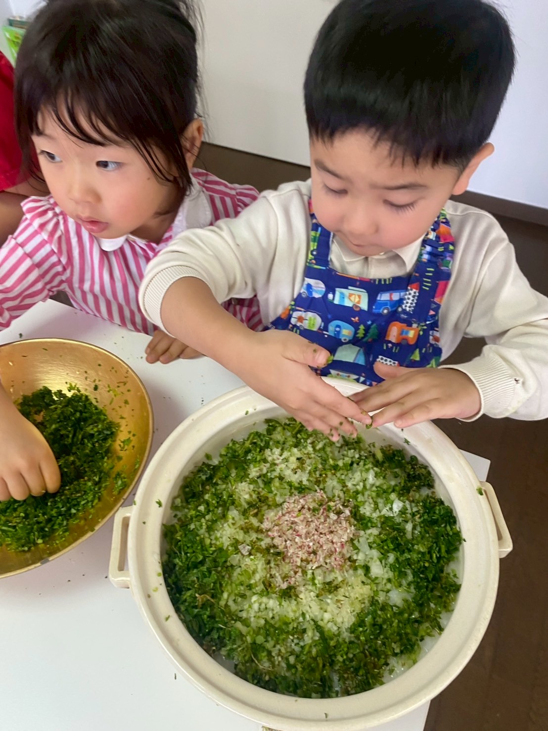 包丁を使っていない人たちが、「七草なずな〜七草なずな〜」と楽しく七草囃子を歌って盛り上げながら、全員が楽しくお料理を進めることができました。