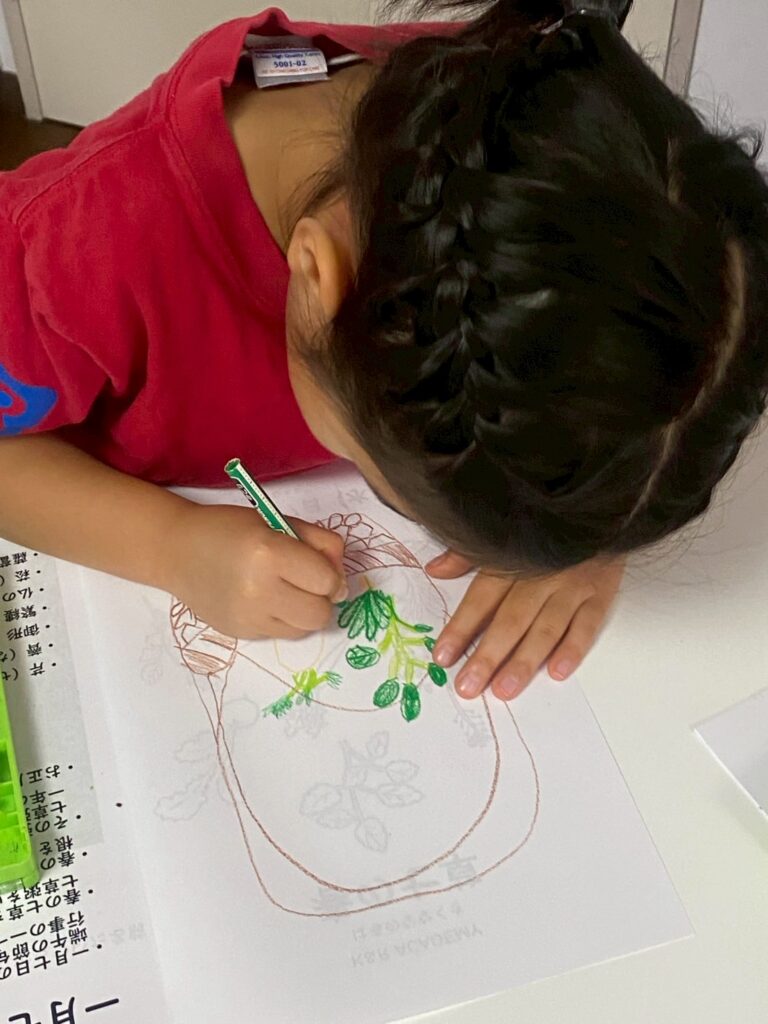 どうやって描けばいいのかな?と迷っても、隣にいるお姉さんお兄さんが上手に描いているのを見て、すぐに真似をしてみてたことで、特徴を捉えた絵を描くことに成功しました。初めて知る葉の名前も、描きながら口に出して言ってみることで自然と覚えている様子が見られました。
