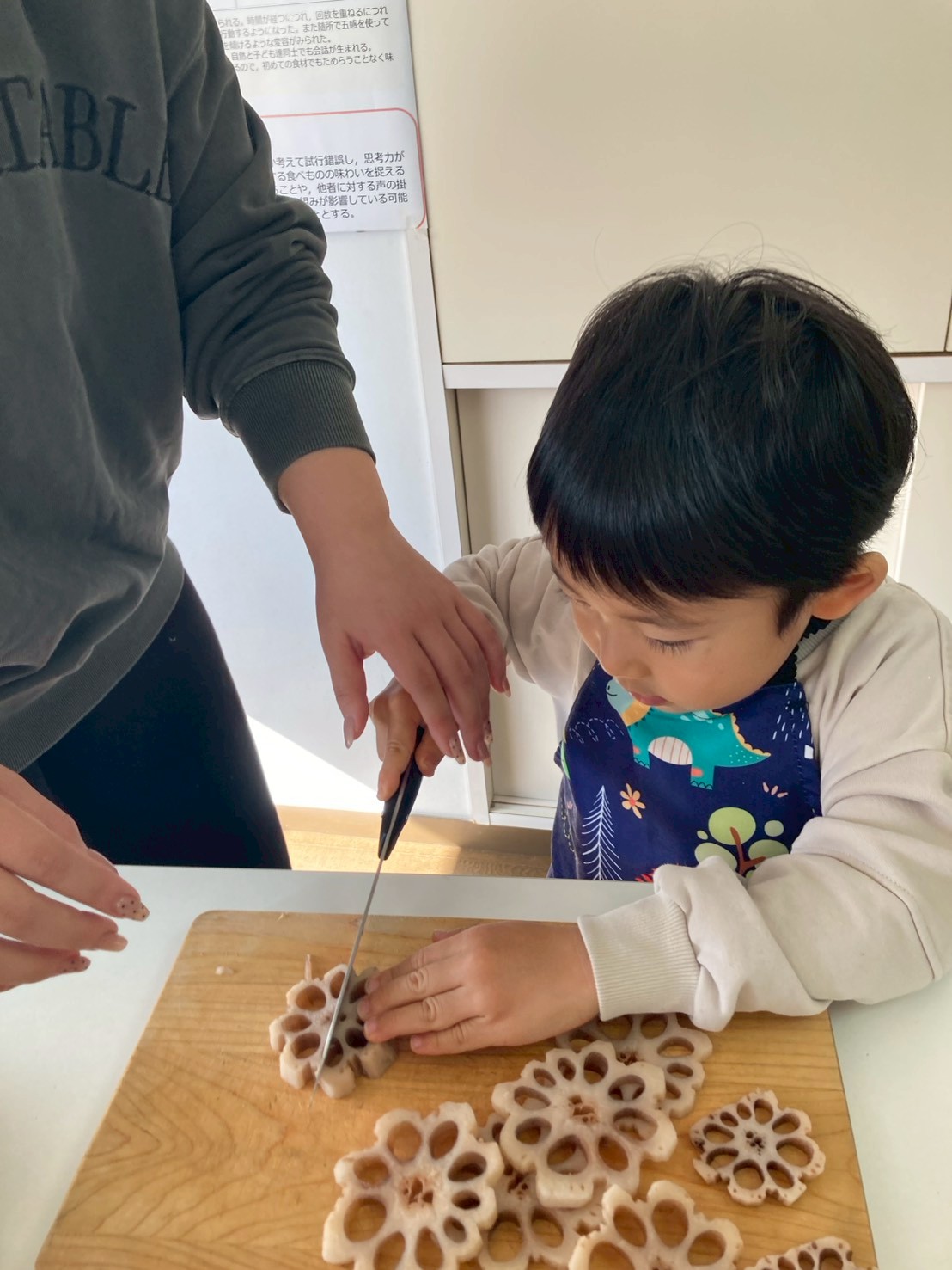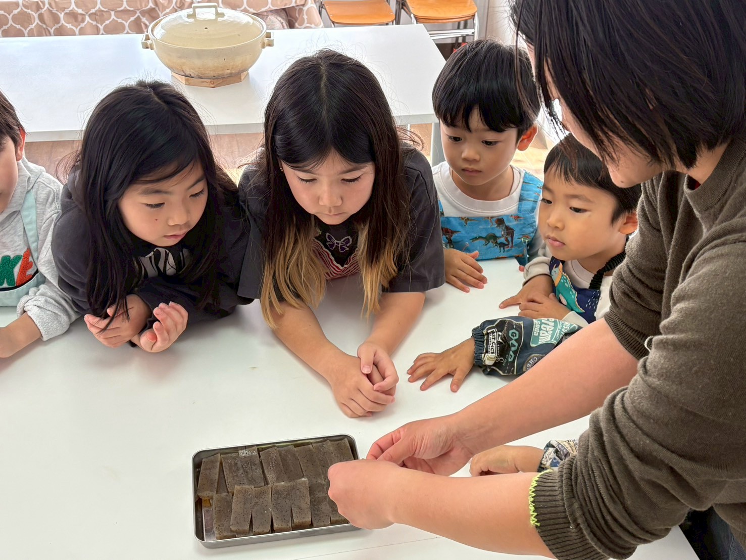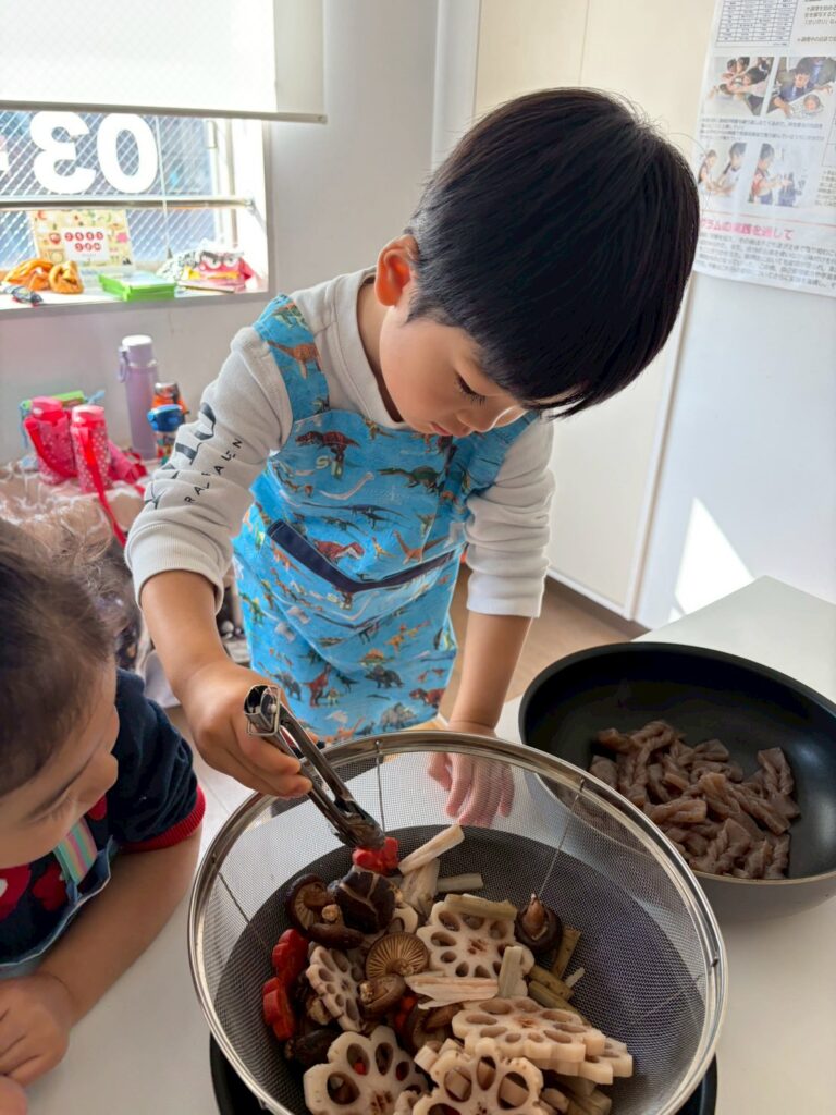 次にお煮しめを作ります。まず、こんにゃくの真ん中に切り込みを入れます。そして、こんにゃくの端をもって、切り込みの中をくぐらせます。手綱こんにゃくの出来上がりです。「くるん!」と入る瞬間が面白いのと、一瞬で姿の変わるこんにゃくに子ども達は夢中で「出来た!もう一つ!」と競い合うようにこんにゃくを手に取っていました。次にレンコンとごぼうを切っていきます。レンコンを切る時に、「シャキシャキ」と聞こえてきて、楽しく切りました。切れたら、こんにゃく、れんこん、ごぼう、椎茸、にんじんをお鍋に入れて、ヒタヒタになるまでお水を入れて火にかけます。