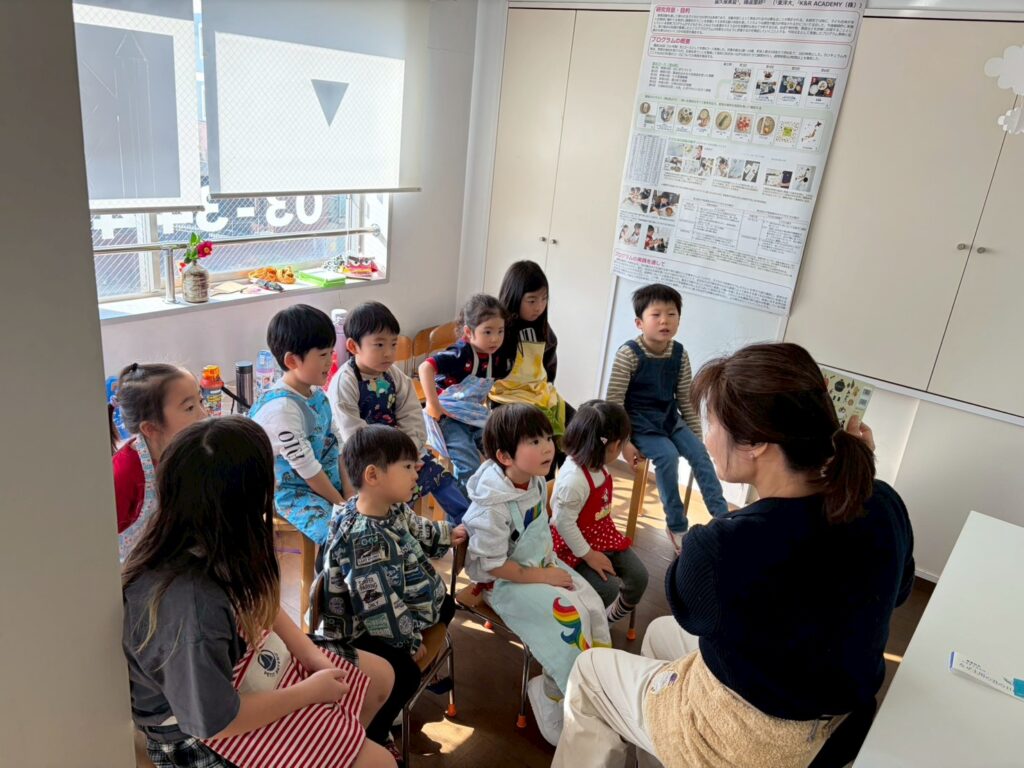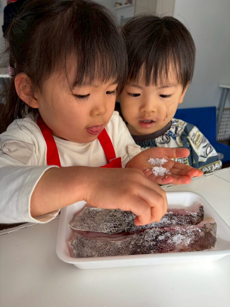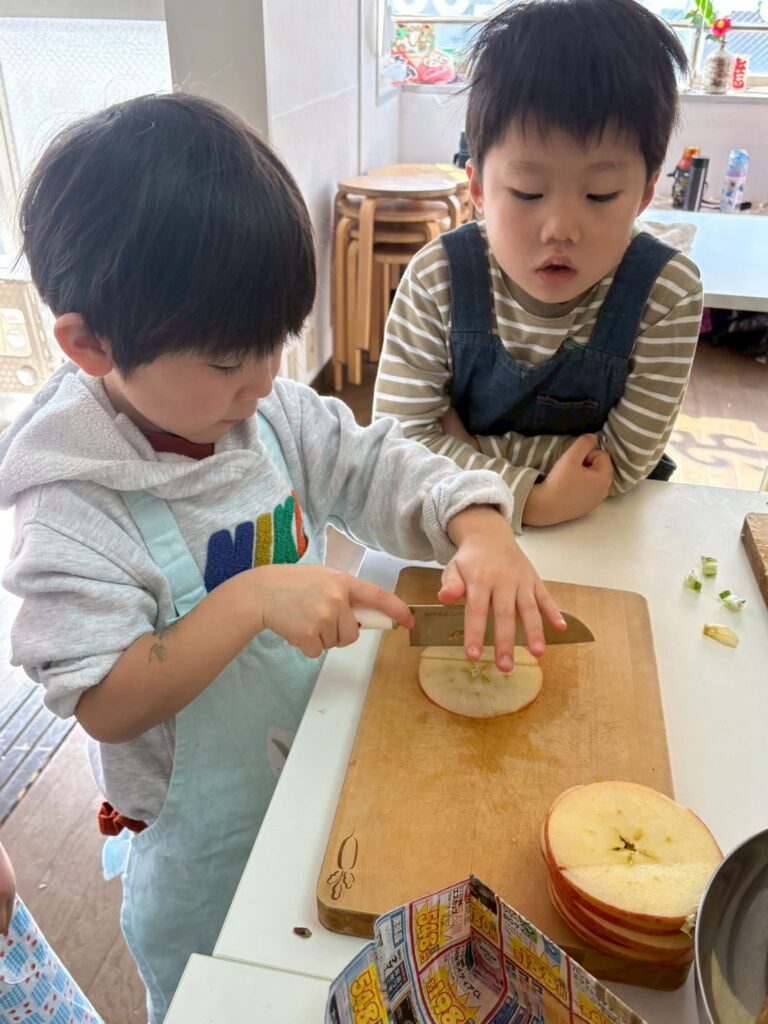 お料理された状態を見ることの多い子ども達にとって、丸ごとのお野菜を間近に見て、触ってという時間はそれぞれの食材への興味を掻き立ててくれます。いざお料理をし始めても、とても丁寧に食材を扱う姿が見られますし、「好きじゃない」と言っていた子が「ちょっと食べてみようかな」と口に運んでいることもあります。