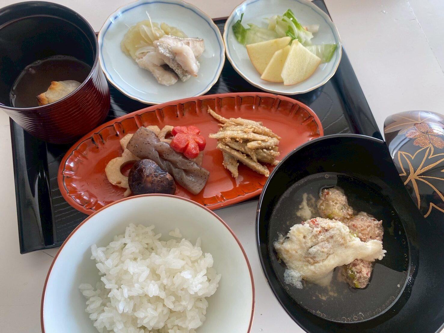 全てのお料理が完成したら、配膳です。お盆から準備に、お箸置き、お箸、ご飯、スープとどんどん並べていきます。スープは、熱々だったので、「熱いの通ります!」と周りに注意しながら慎重に運びました。全て並び終え、待ちに待ったいただきますの時間です。食べると、白菜とりんごのサラダはシャキシャキと、ごぼうはぽりぽりと、音が聞こえてきました。作っているときも食べているときも、食材の音を聞きながら今日も美味しくいただけました。