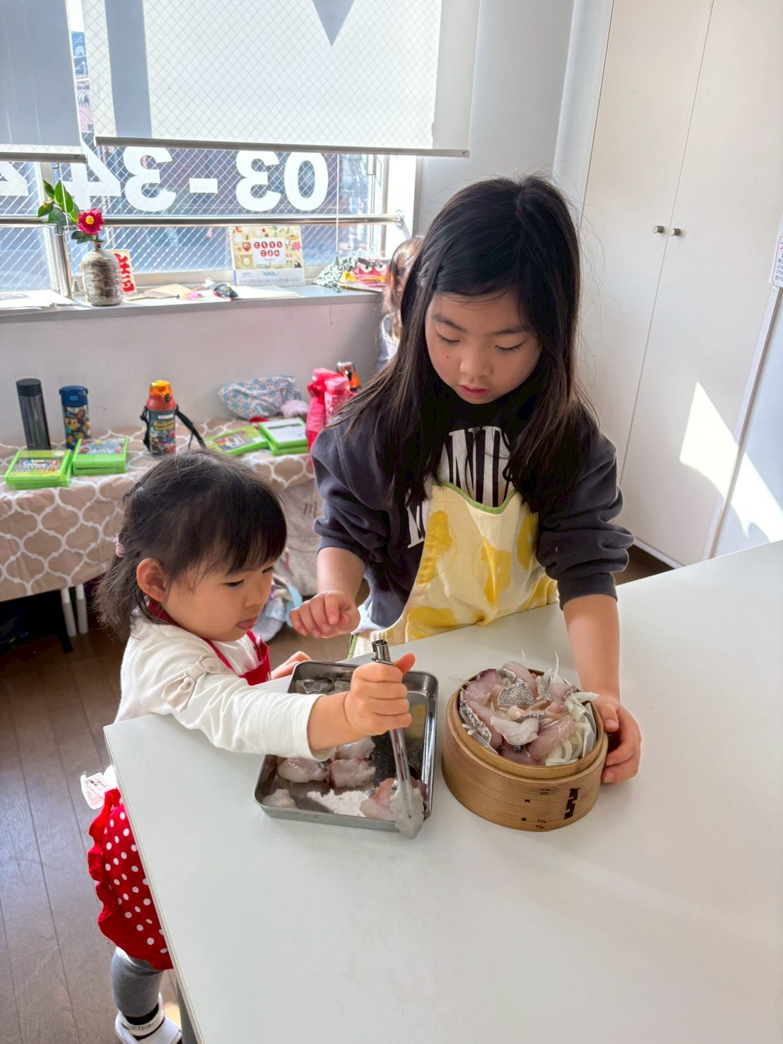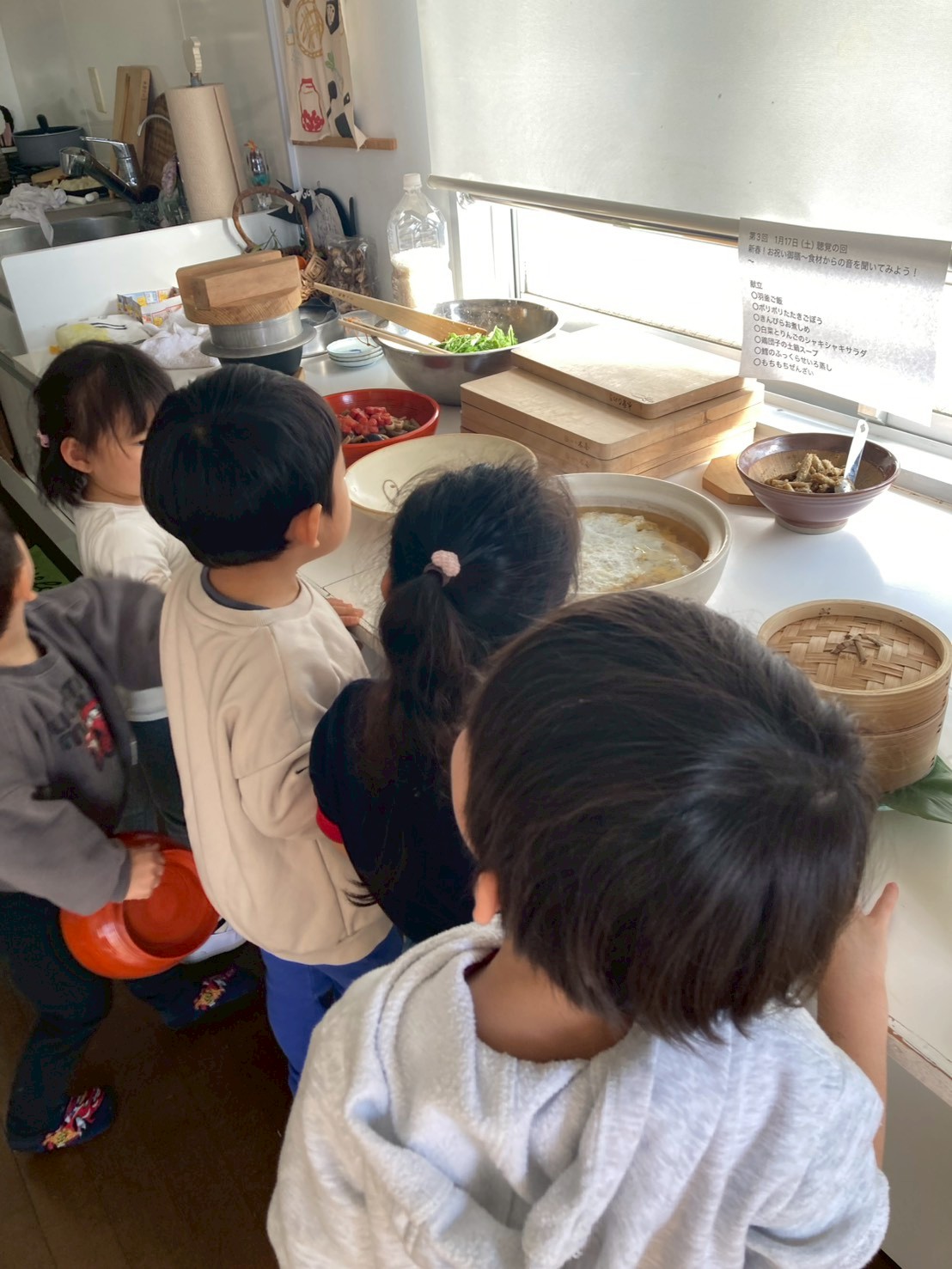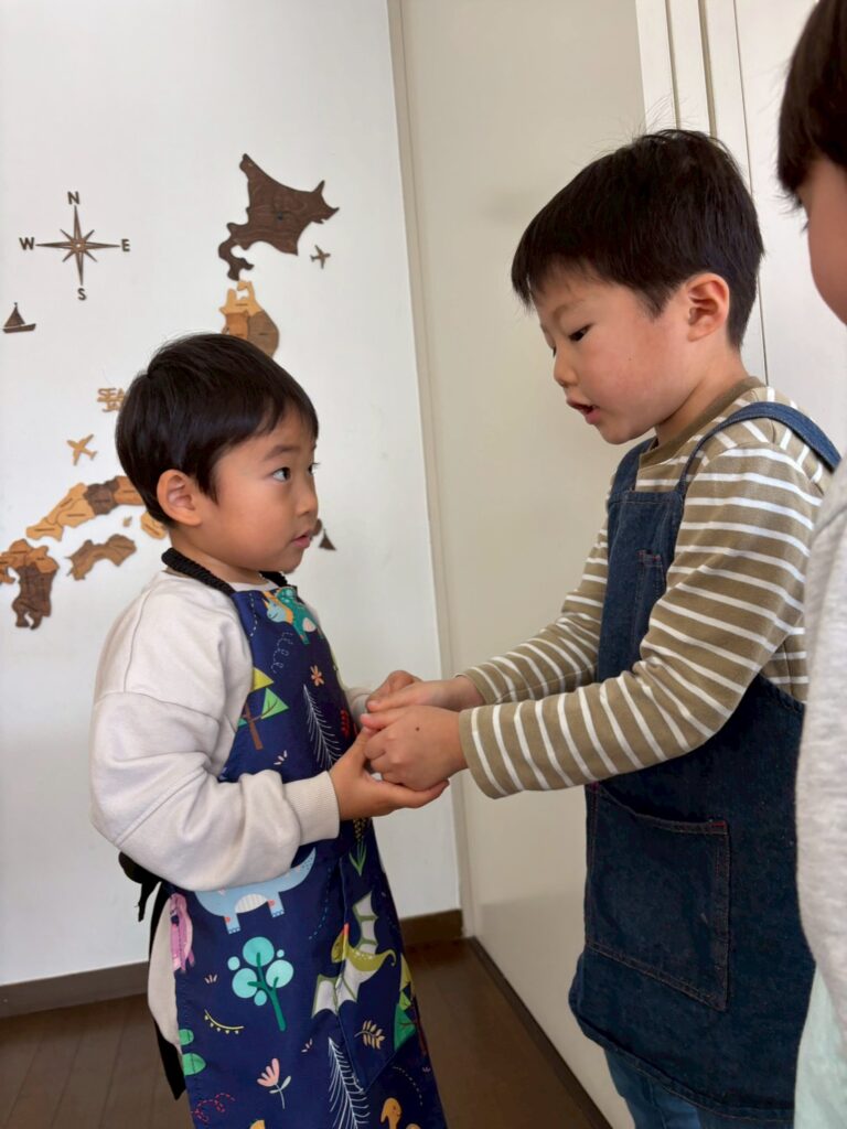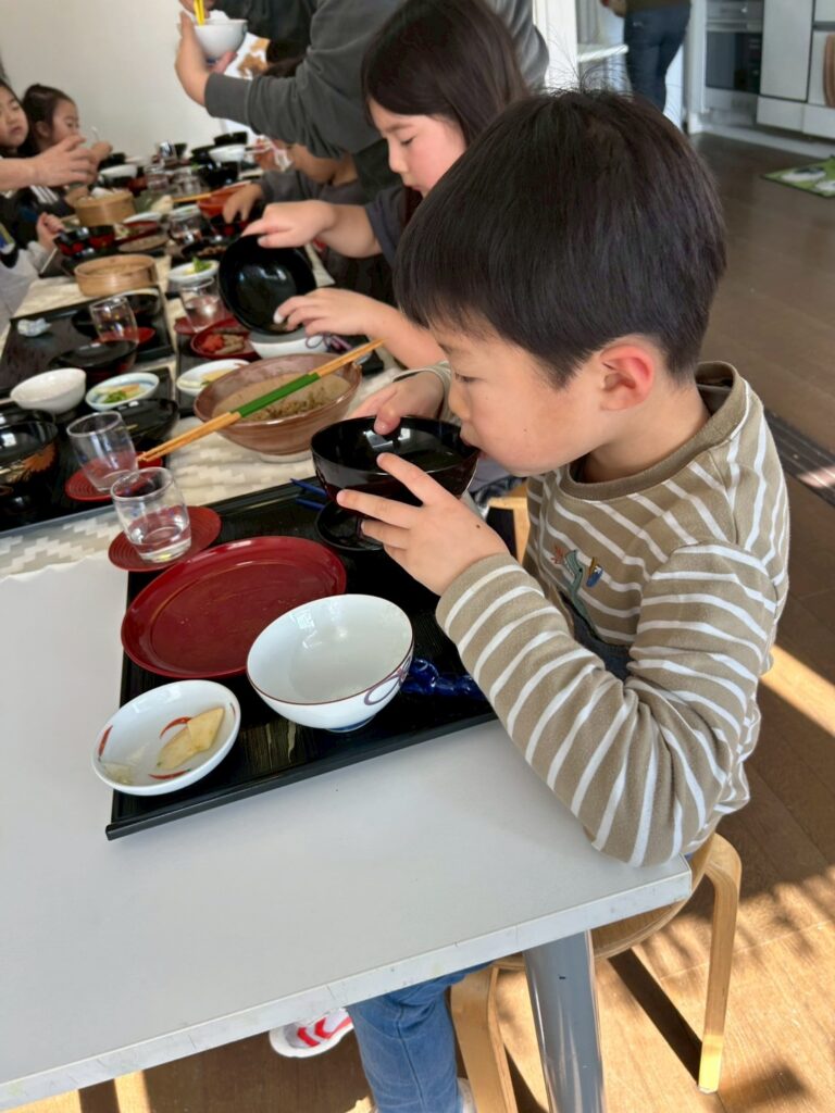 ごぼう、小豆のほかにも鱈にお塩を振りかける、お米をあらう、鶏団子のタネをこねるなど沢山の準備を同時にどんどん進めていきます。それなので、部屋の中はそれぞれがお料理をする音やお互いに掛け合う声でいっぱいになります。お隣の音に引き寄せられて、「何をしているんだろう?」と覗きにいったり、「洗ったものを拭いてくれる人ー?」という声に素早く反応し、拭きに来てくれたりと、自分がやっていること以外からも刺激がたくさんあります。