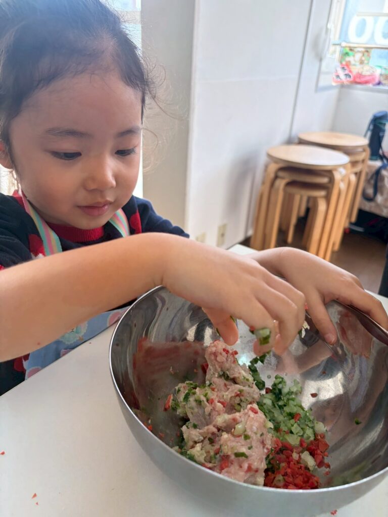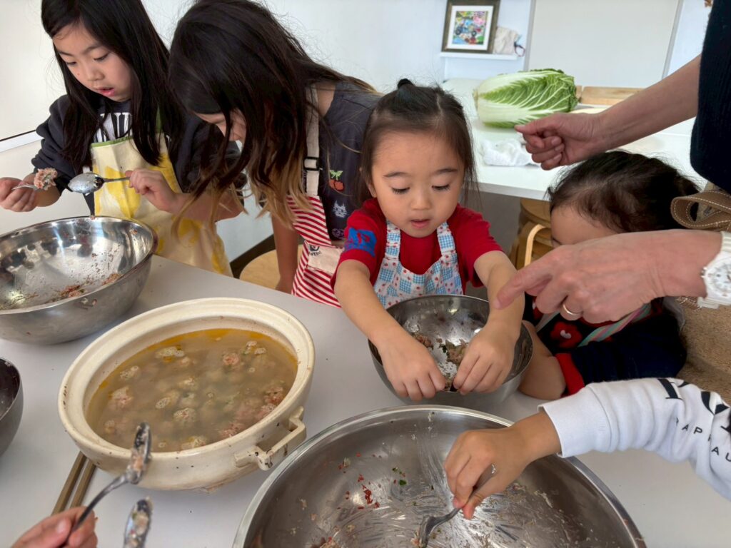 次は鶏団子づくりです。年少さんチームがこねてくれたものをみんなで二つのスプーンを使って、ひとつひとつ丁寧に丸めていきました。驚くほどの集中力で、静かに、でも確実に団子が増えていきます。