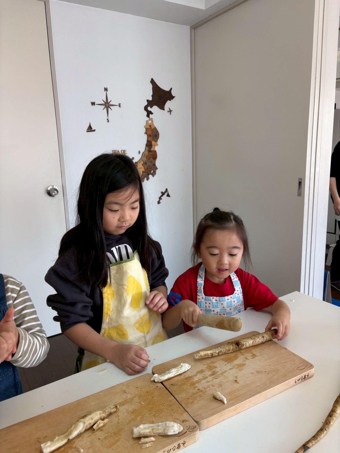 お絵描きをしながら、だれがどの食材の準備に取り掛かるかの役割分担もしました。土だらけのごぼうは年長さんの2人がピカピカに洗ってくれることに。そしてぜんざい用の小豆の重さを計るという大事な役目は小学生のお姉さんにお任せすることになりました。