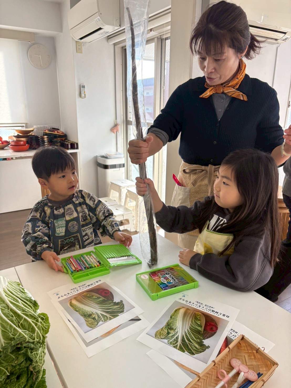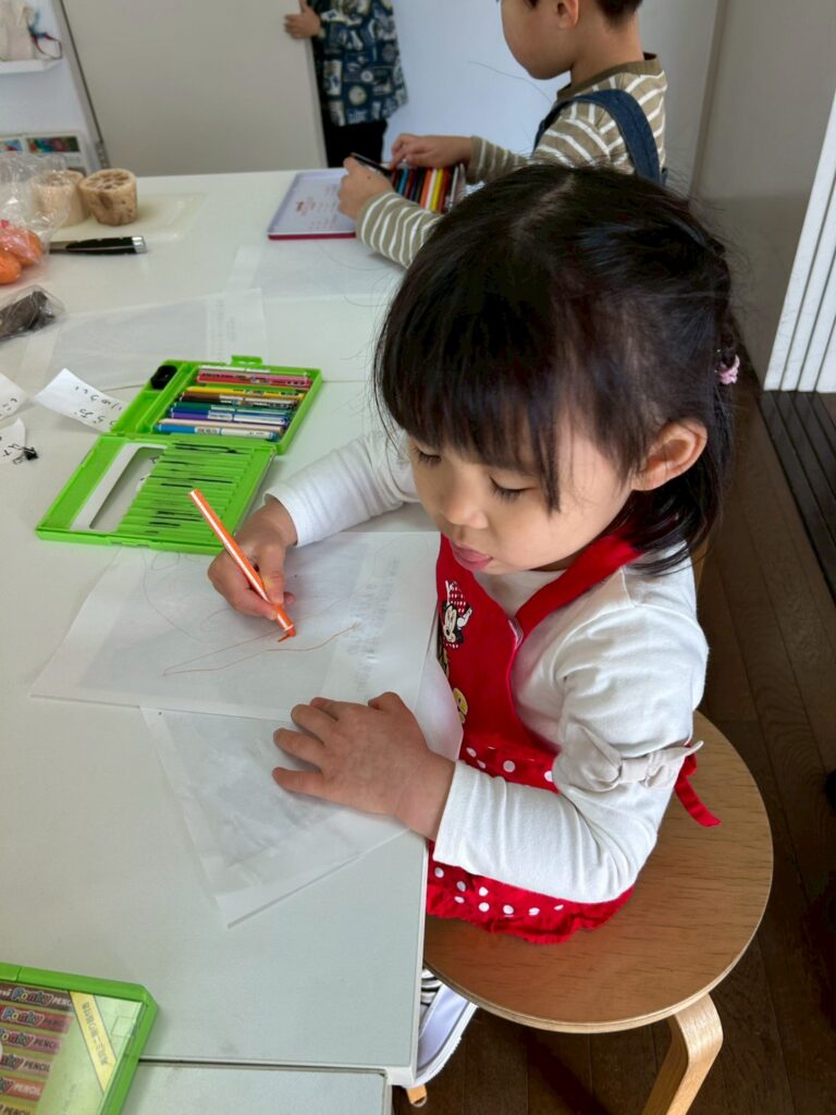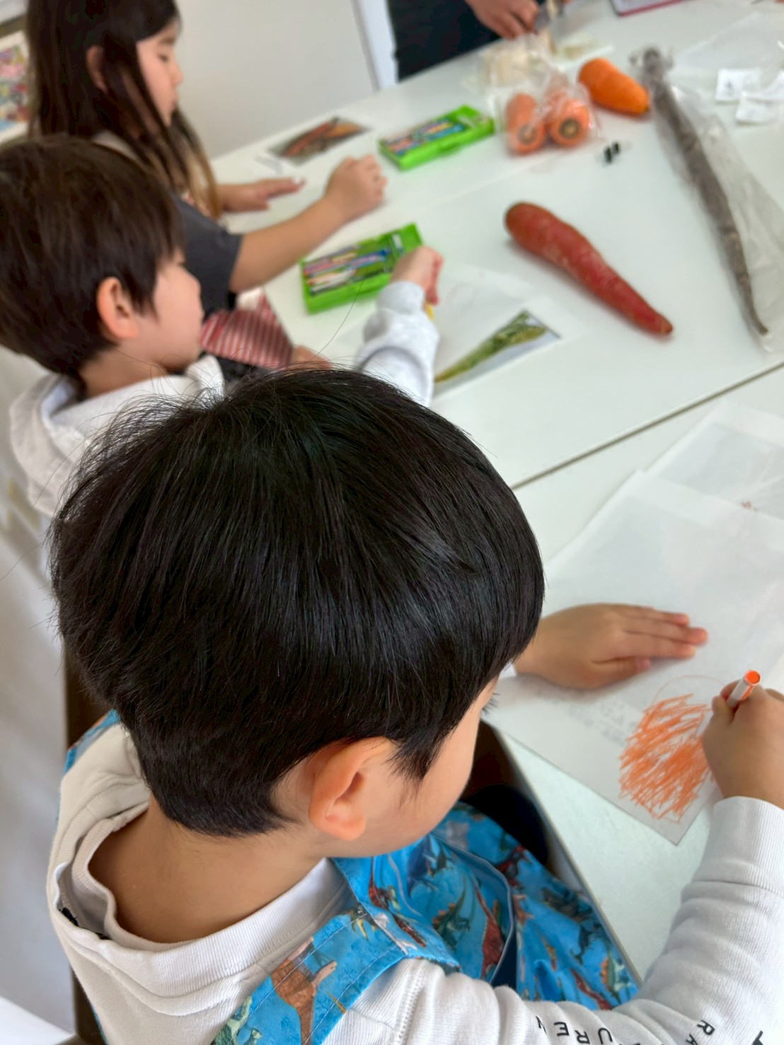 まずは、大きなお野菜をスケッチするところからスタート。細長くてごつごつしたごぼう、普段よく見るオレンジ色とは違う、鮮やかな金時にんじん。形や色をよく見てスケッチできていました。