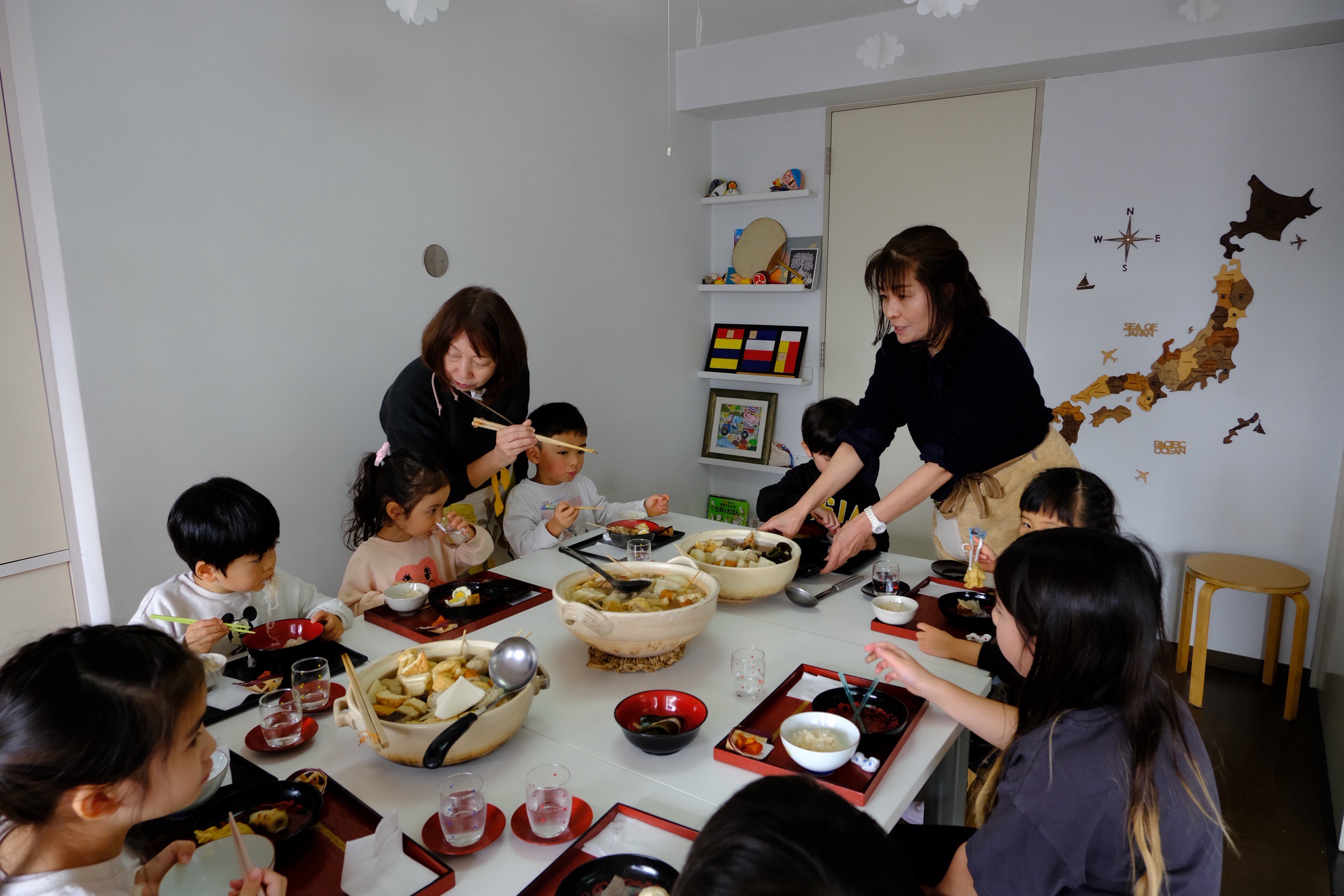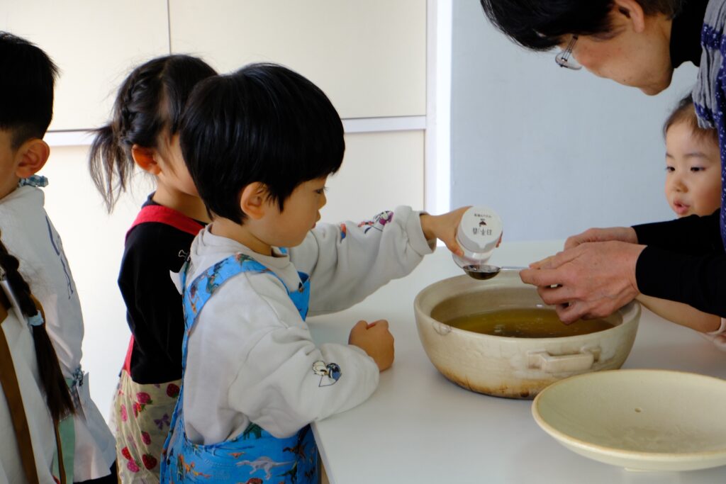 配膳が済んだら、待ちに待ったお食事の時間です。元気よく「いただきます!」をすると、どの子もとても美味しそうに、たくさんおかわりをして食べていました。お出汁で炊いた茶飯もとても人気で、何杯も食べている子もいました。同じように作っていても、3つの土鍋の味が違って仕上がるのがとっても不思議。今度は向こうのお鍋を食べてみようかな?と味くらべをしてみている子もいました。